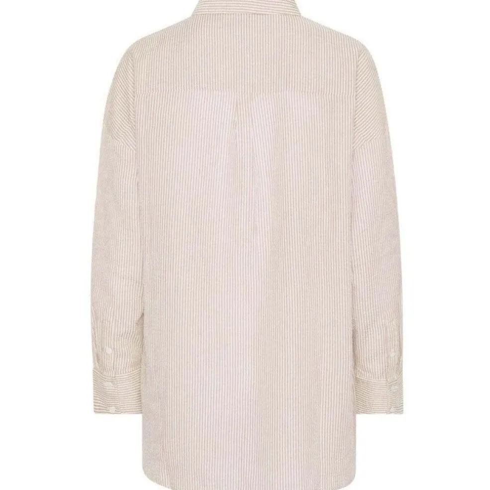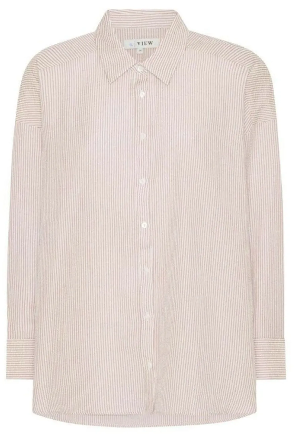 Stribet skjorte fra A-View i sand- og hvide nuancer. Skjorten har en oversize pasform med længere bagstykke og klassisk krave.