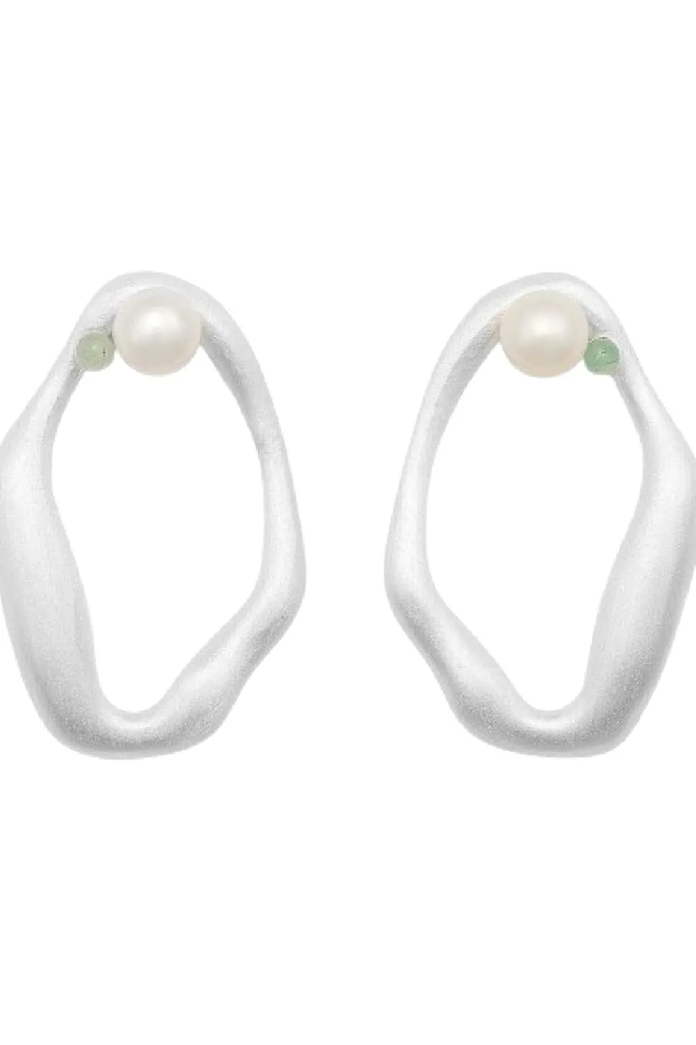 Sølvfarvet ørering fra Sorelle Jewellery med en bølgende form. Øreringen har en rund ferskvandsperle og en lille grøn aventurinsten som udsmykning.