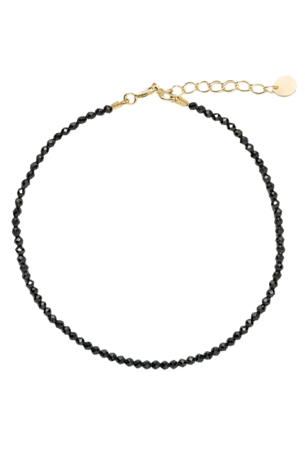 Håndlavet ankelkæde fra Sorelle Jewellery. Den er fremstillet på et dansk værksted med små, facetterede sorte spinelperler og har en forgyldt finish.