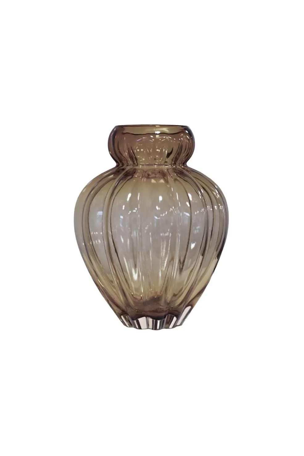 Røgbrun vase fra Specktrum med bulbøs form og smal hals. Vasen har lodrette riller i glasset og en afrundet bund, der giver den et karakteristisk udtryk.