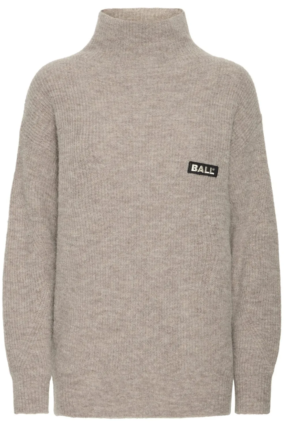 Pullover med høj hals fra Ball i en neutral khaki-farve. Pulloveren har lange ærmer og et lille rektangulært logo på venstre bryst.