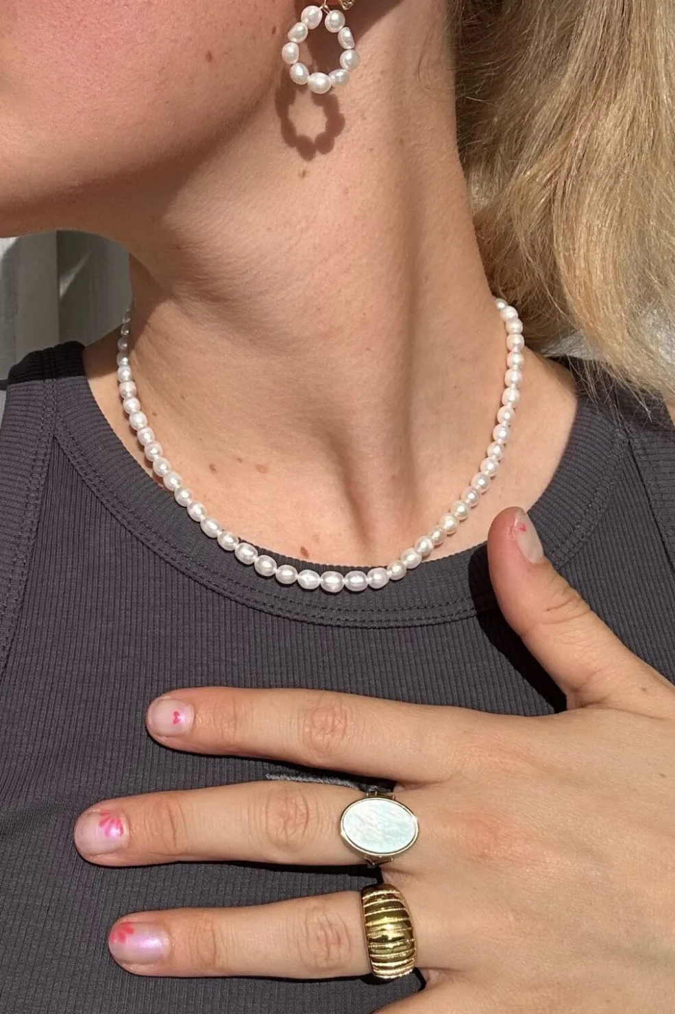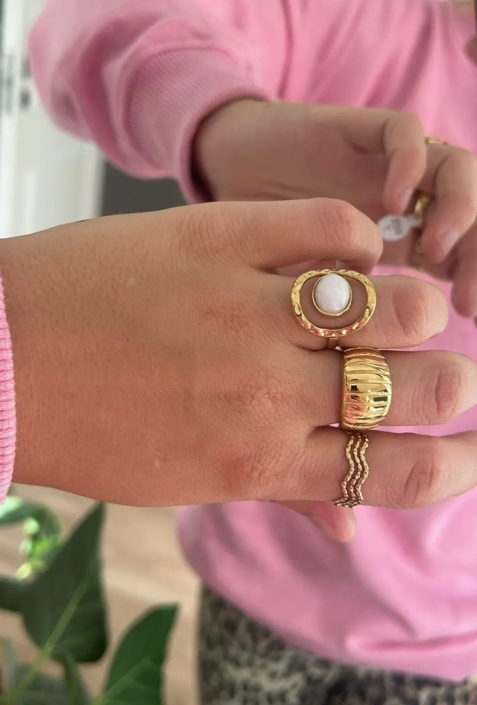 Gylden ring fra Anobel Copenhagen med en struktureret overflade. Ringen har et skandinavisk design med et mønster, der giver den et særpræg.