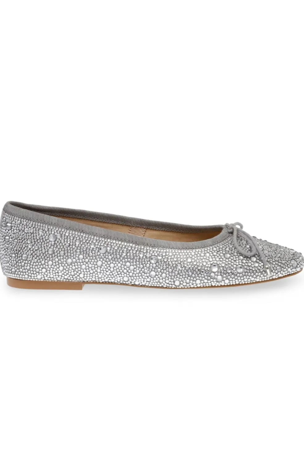 Sølvfarvet ballerina fra Steve Madden med små perledetaljer og rund tå. Skoen har en lav hæl og et ensfarvet design med en sløjfe foran.