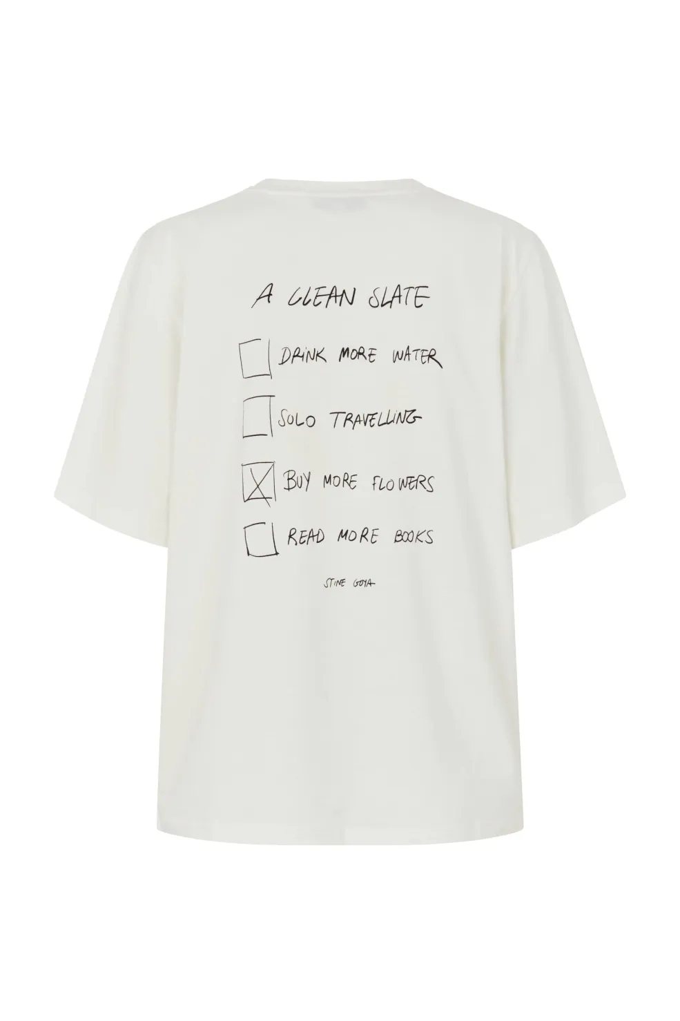 T-shirt fra Stine Goya i en lys cremefarvet nuance med blomsterprint i gule og grønne nuancer på forsiden.