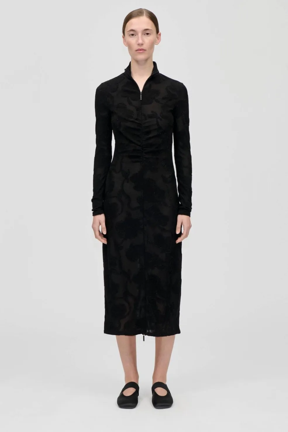 Kjole fra Stine Goya med et blomstret mønster i sorte nuancer og metallicdetaljer. Kjolen har en høj halsudskæring og lynlås foran.