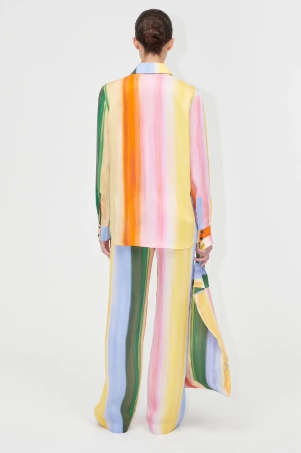 Langærmet skjorte fra Stine Goya med striber i gul, pink, blå og grøn. Skjorten har en skjortekrave og knaplukning foran med sorte knapper.