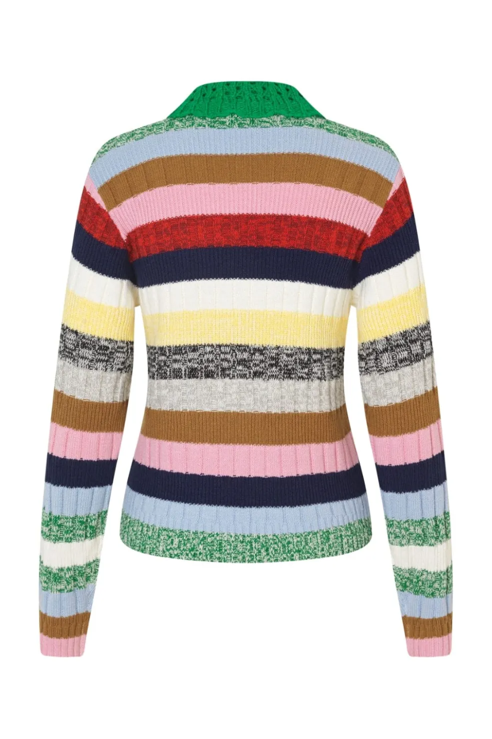 Stribet sweater fra Stine Goya med hæklet polokrave i grøn. Sweateren har et farverigt stribemønster i rød, blå, gul og grøn, der skaber et kunstnerisk udtryk.
