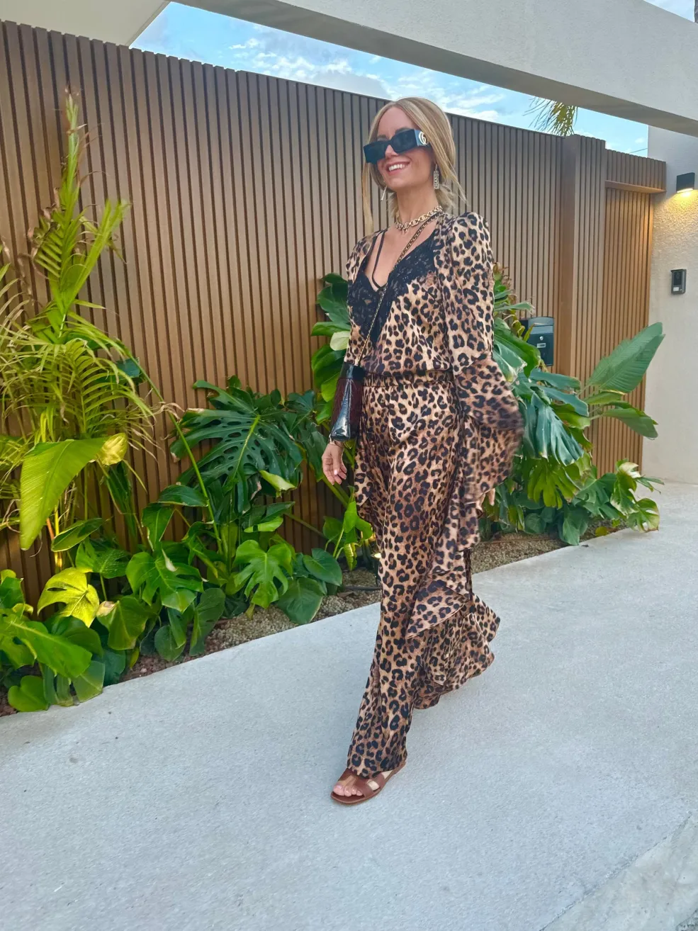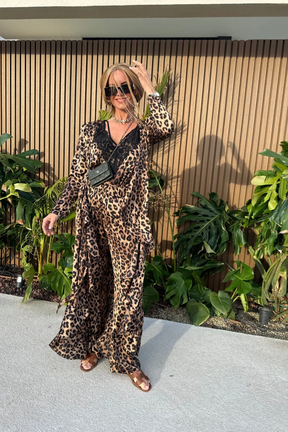 Leopardmønstret top fra Valentin Studio med tynde stropper og blondekanter. Toppen har en V-udskæring og snoredetaljer, der giver mulighed for at justere pasformen.