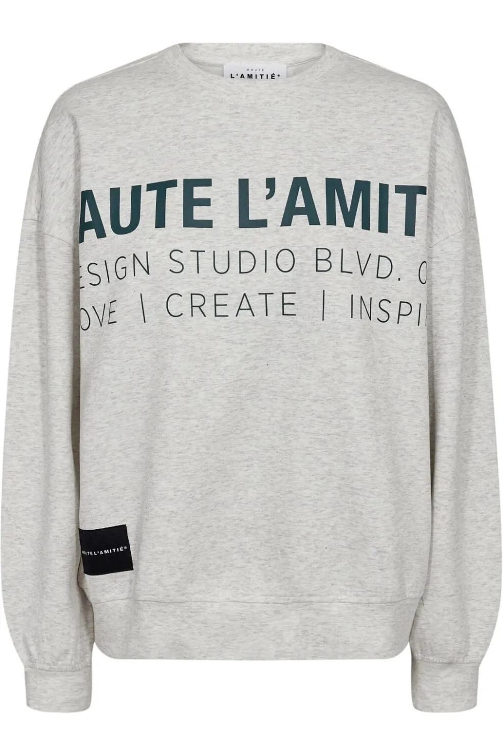 En sweatshirt fra Haute L’Amitié i lysegrå melange. Sweatshirten har en oversized pasform og sort tekstprint på forsiden.