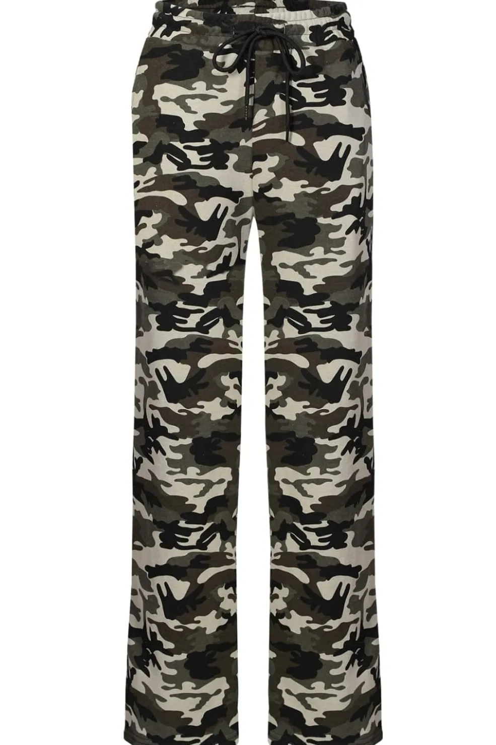 Bredbenede bukser fra Liberte med camouflagemønster i grønne og beige nuancer. Bukserne har gulvlængde og snørelukning i taljen.