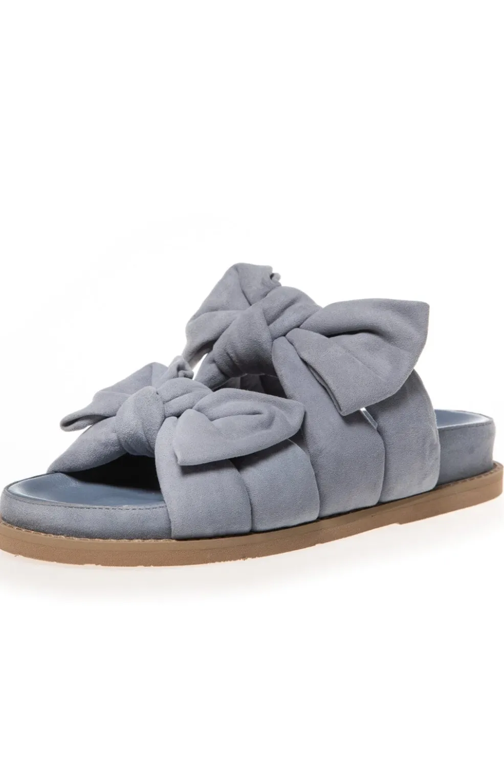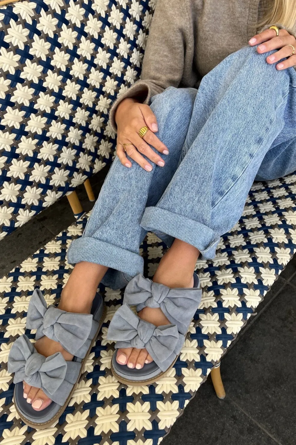 Sandaler fra Copenhagen Shoes i ruskind. Den grå nuance Cloud har store sløjfer på stropperne og en åben tå. Sandalen har en flad sål med lys bund.