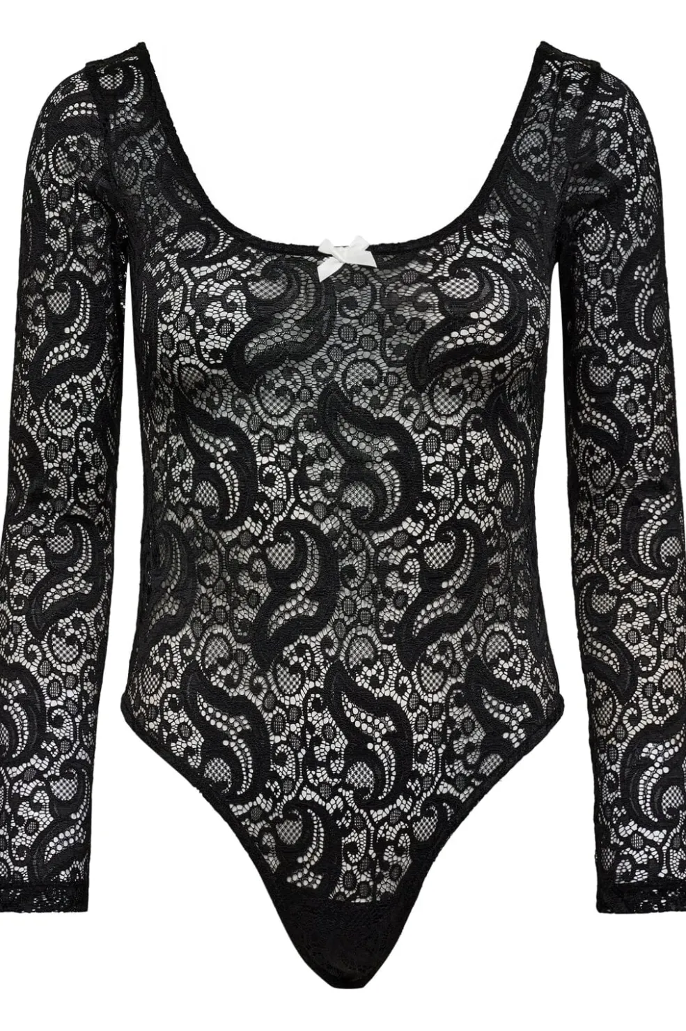 Sort blondebody fra Haute L’Amitié med lange ærmer. Blonden har et blomstermønster, og en lille hvid sløjfe sidder ved udskæringen.