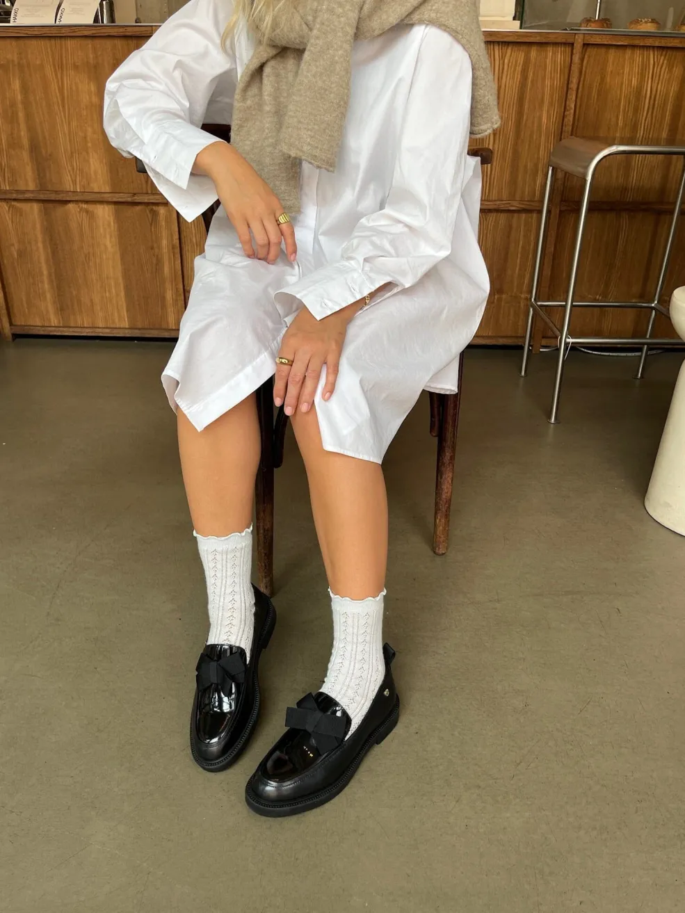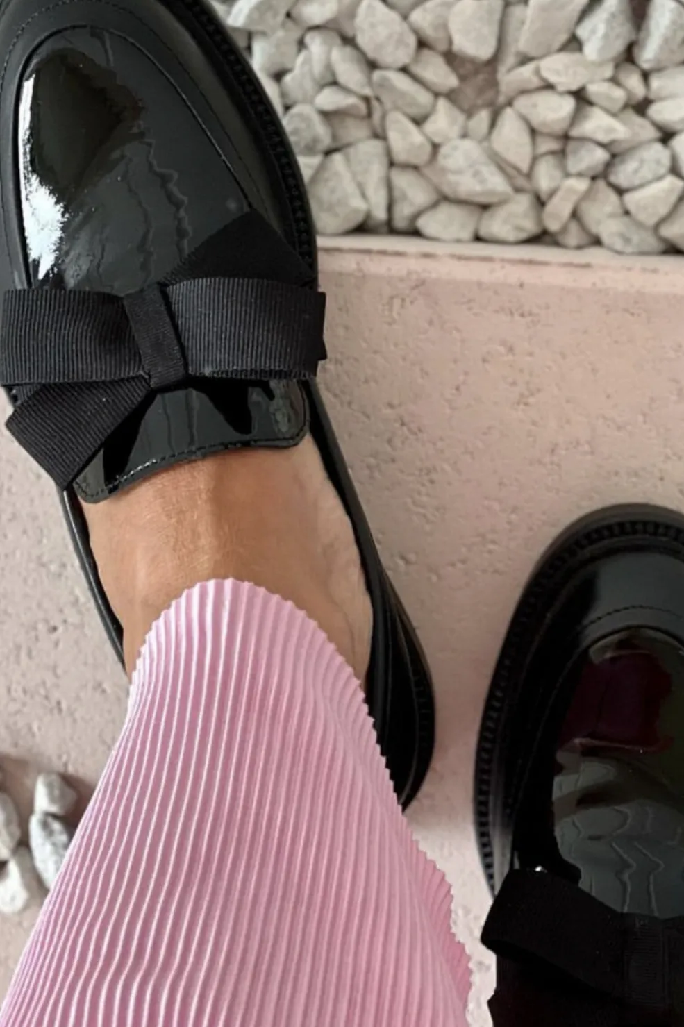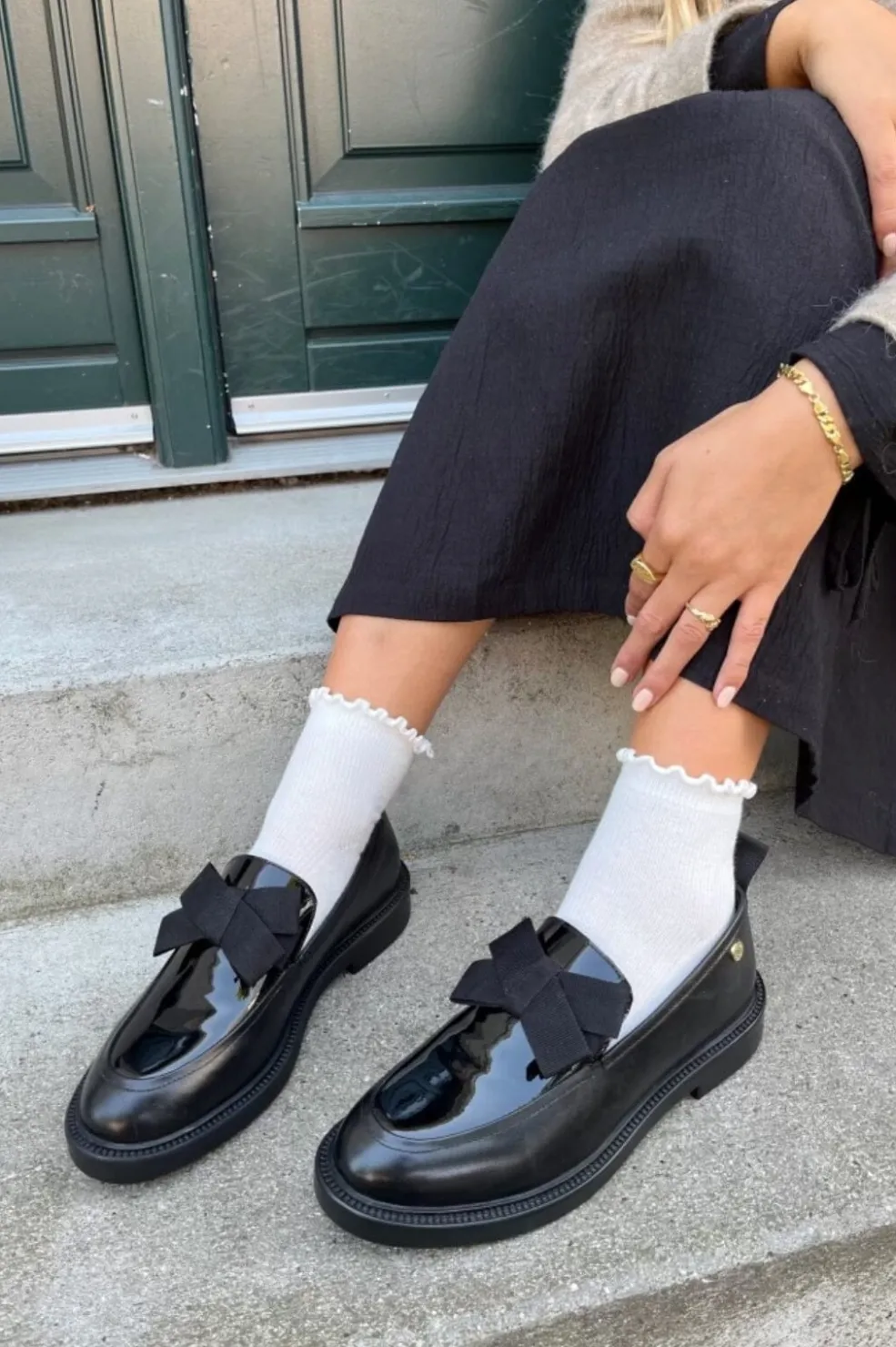 Sorte loafers fra Copenhagen Shoes i læder med lakdetaljer og sløjfe på overdelen. Skoene har bløde gummisåler og særlige latexskum-indersåler.
