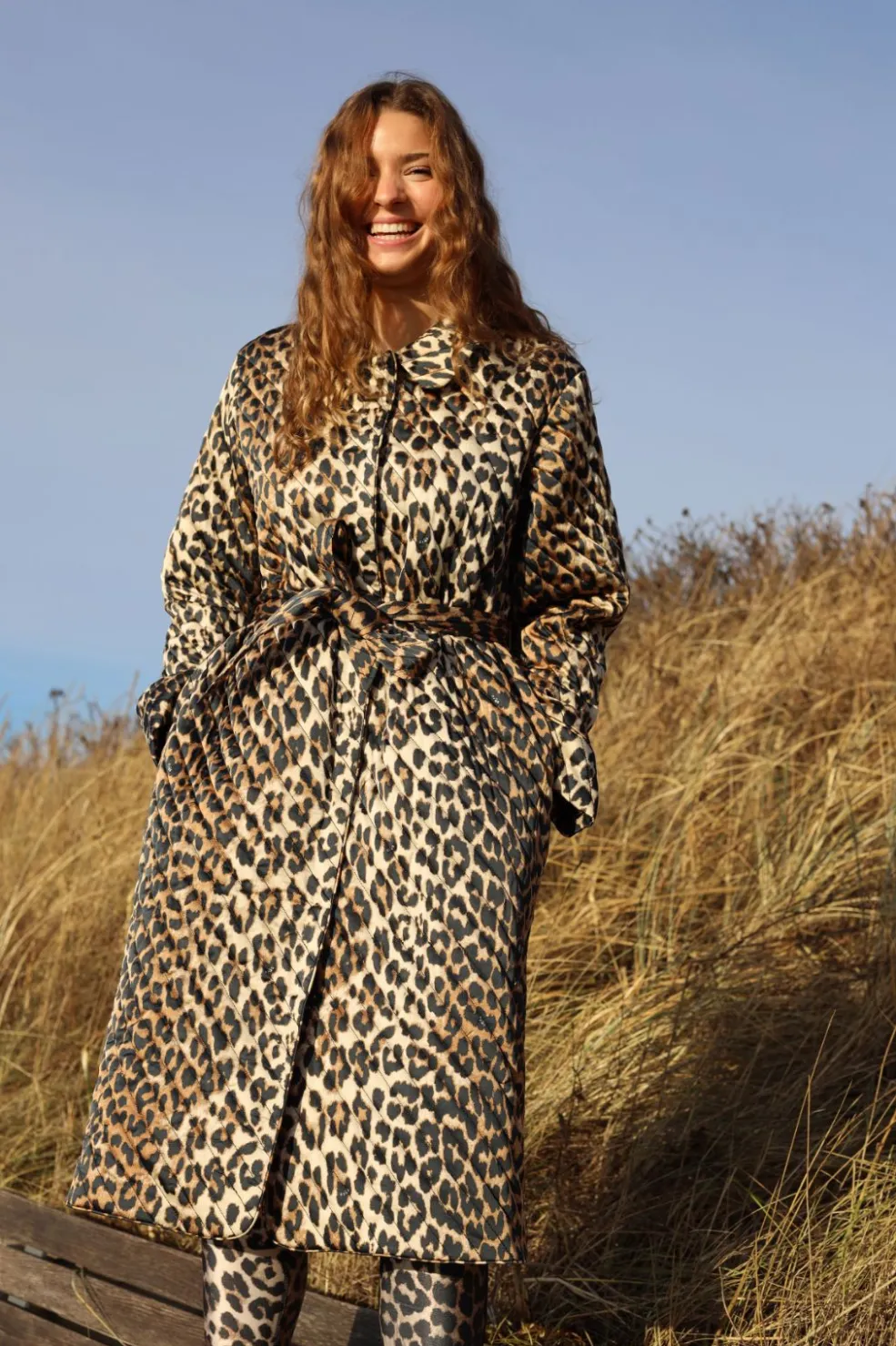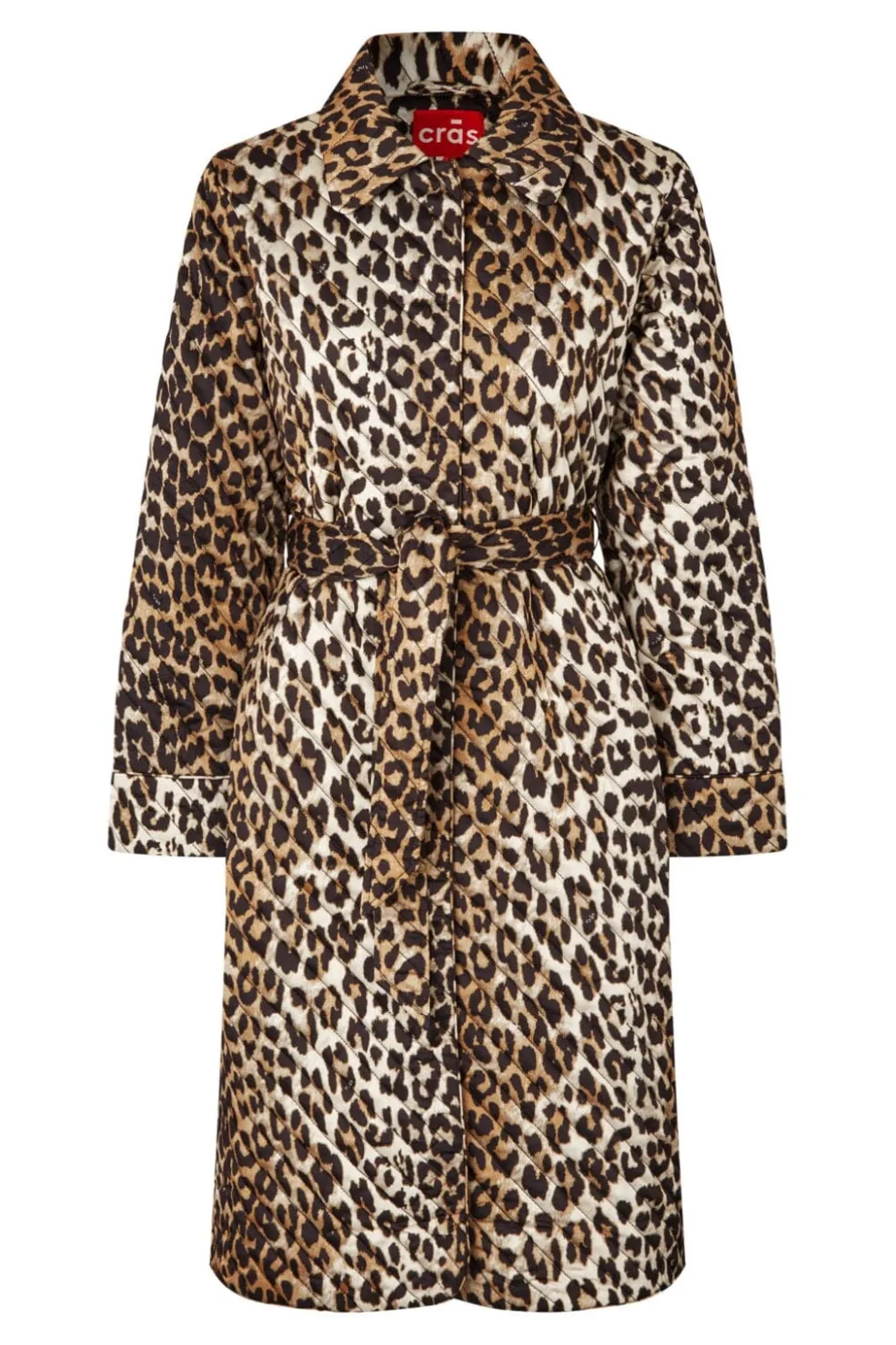 Frakke fra Cras med leopardmønster i brune, sorte og beige nuancer. Den har skjortekrave, knaplukning og et bindebånd i taljen. Fremstillet af genanvendt polyester.