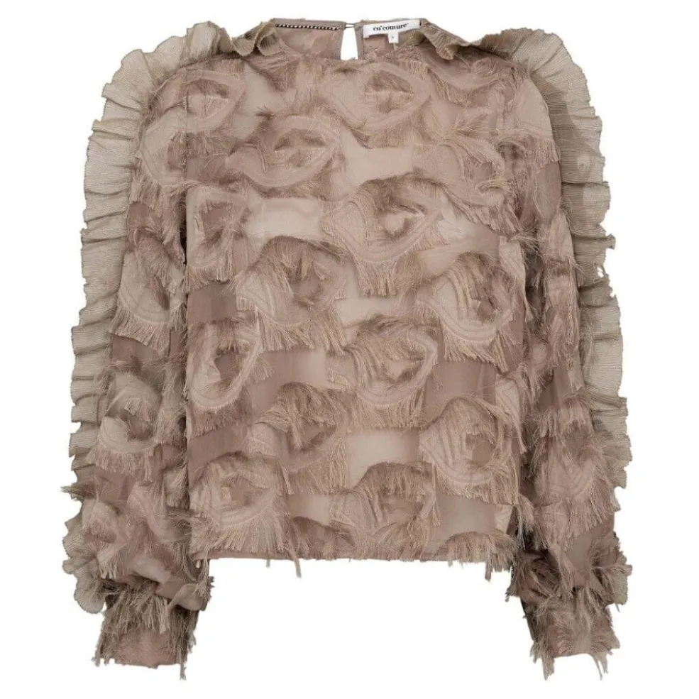 Brun bluse fra Co’Couture i valnødfarvet polyester. Blusen har en struktureret overflade med lag af ruflede detaljer og lange ærmer med rund halsudskæring.