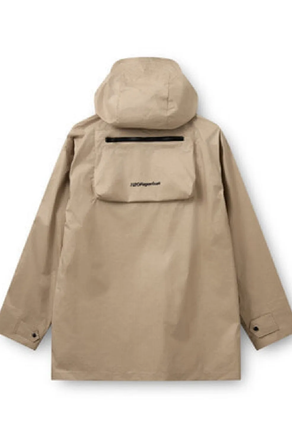 Sandfarvet regnfrakke fra H2O Fagerholt i let nylon. Den høje hals og lynlåslukning giver god beskyttelse mod regn og vind.