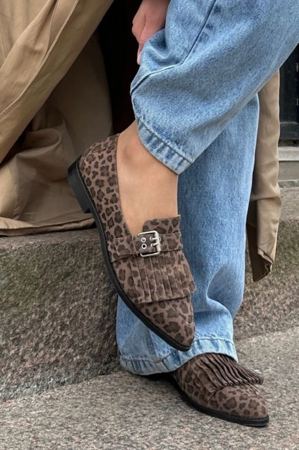 Loafers fra Copenhagen Shoes i ruskind med leopardprint. Skoene har frynser foran og en spids tå samt en praktisk spændelukning.