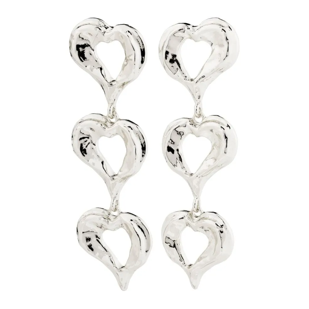 Sølvbelagte øreringe fra Pilgrim med tre sammenkædede hjerter i lodret design. De blanke hjerter har en organisk form og er lavet af genbrugsmaterialer.