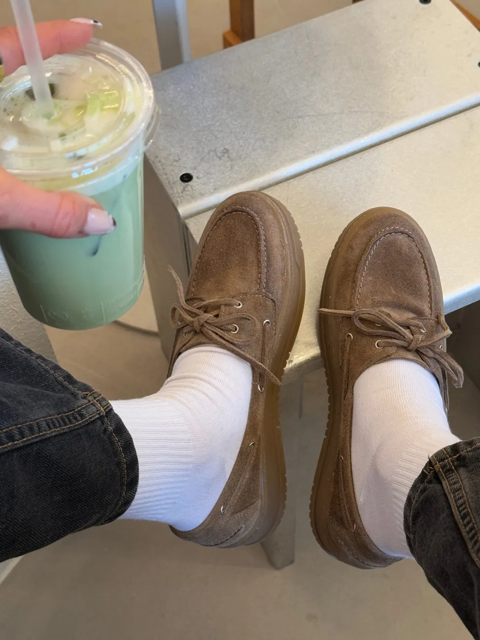 Brun sko fra Phenumb Copenhagen i ruskind med rund tå og snørebånd. Skoen har en lav hæl og en solid konstruktion, der gør den praktisk til hverdagsbrug.