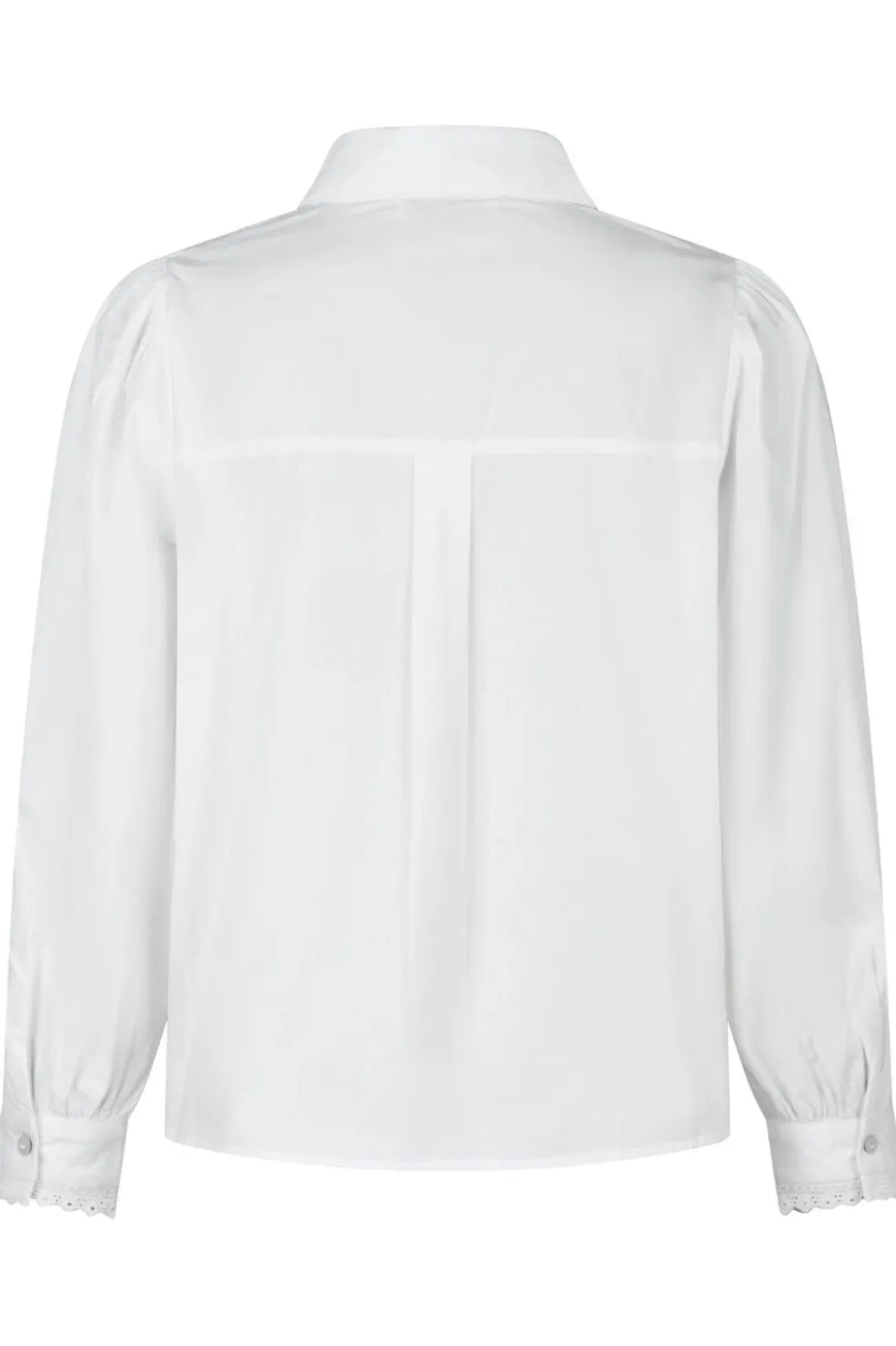 Hvid poplinskjorte fra Neo Noir med pufærmer og blondedetaljer. Skjorten har en skjortekrave og knaplukning med dekorative blondekanter langs fronten.