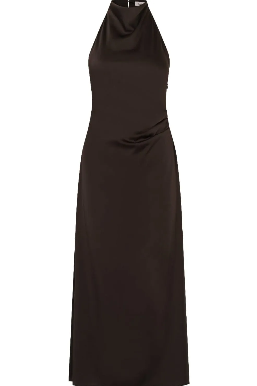 Brun kjole fra Modström, lavet af polyester med elastan. Kjolen passer til formelle begivenheder, bryllupper og festlige lejligheder.