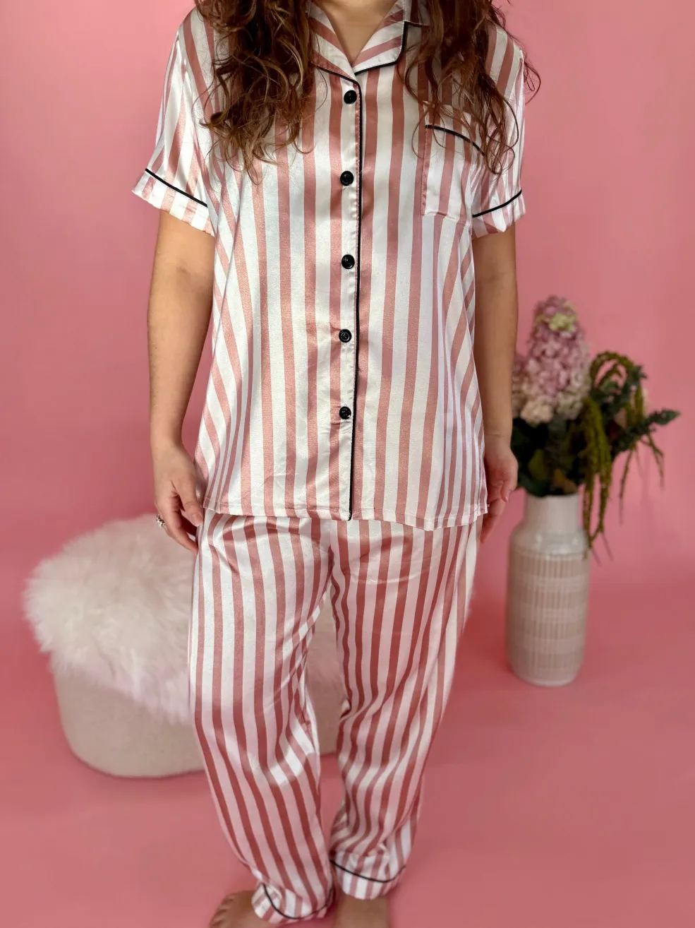 Beige stribet pyjamas fra A-bee med skjortekrave og knapper foran. Sættet har en slim fit og ankellængde med sort piping langs kanterne.