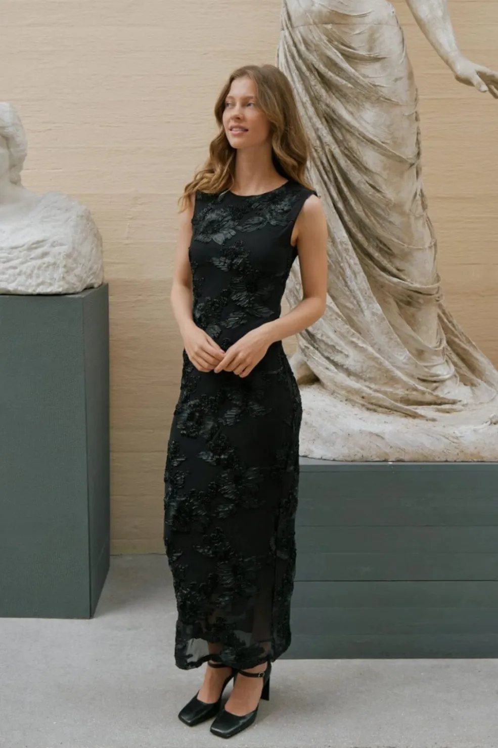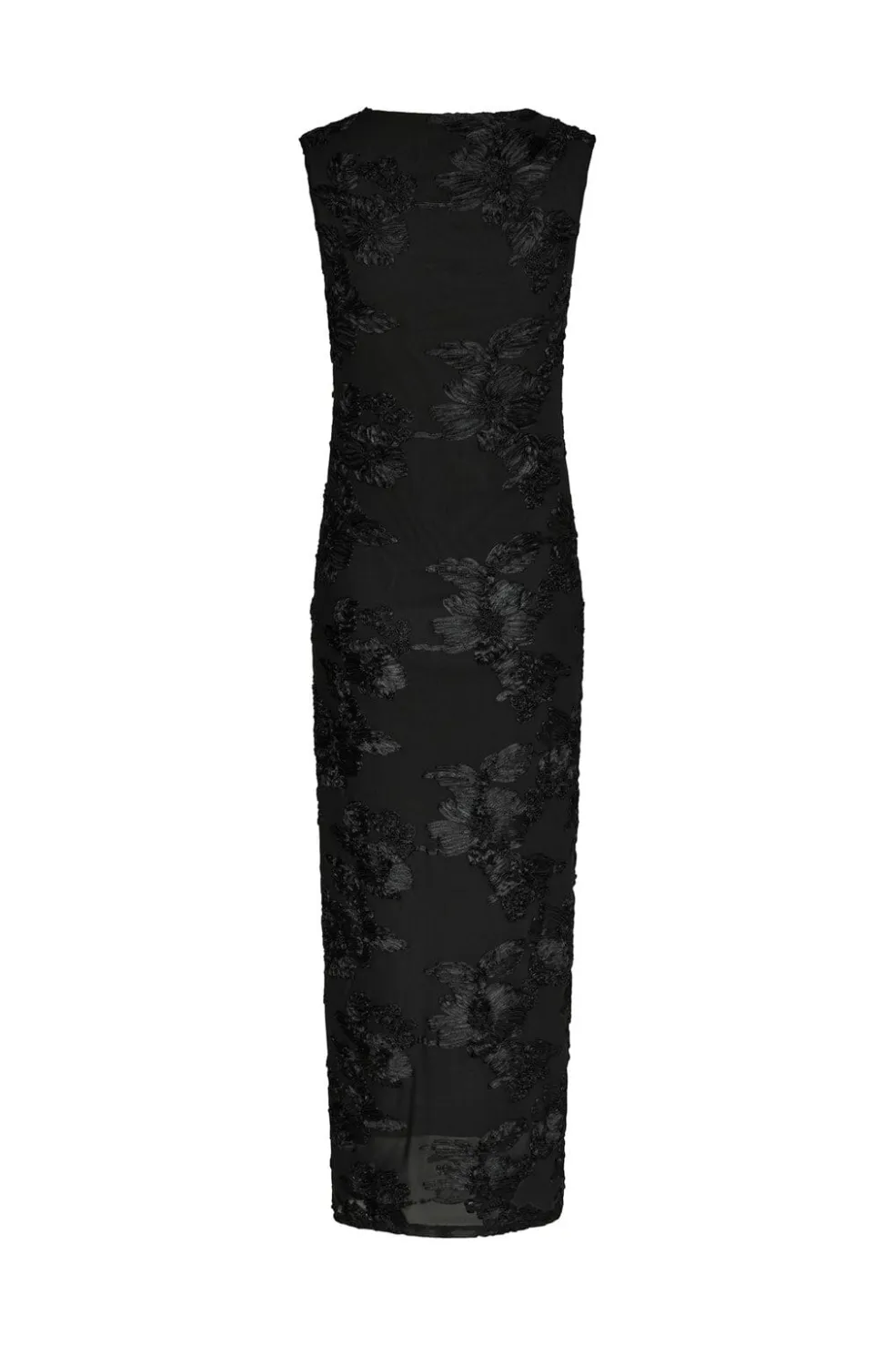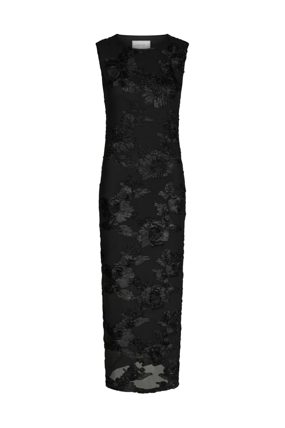 Sort kjole fra Neo Noir, lavet af mesh-materiale med 3D-blomsterbroderi. Kjolen er ærmeløs og har en slim fit-pasform med ankel-længde.