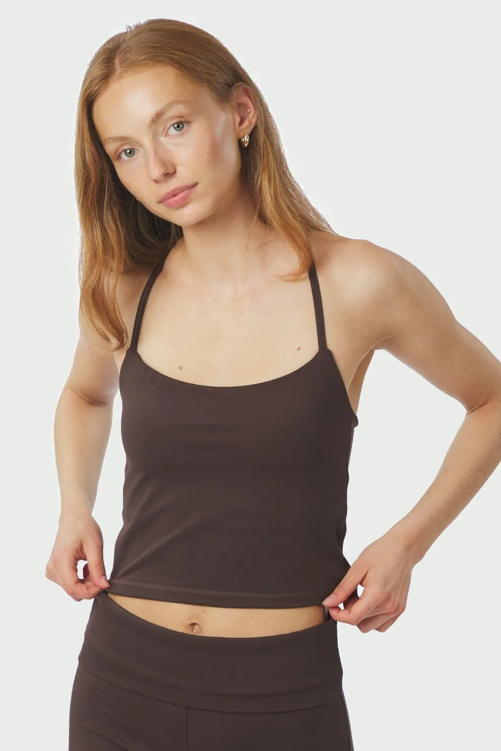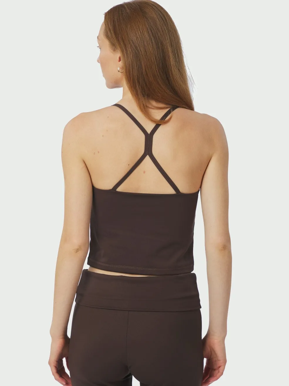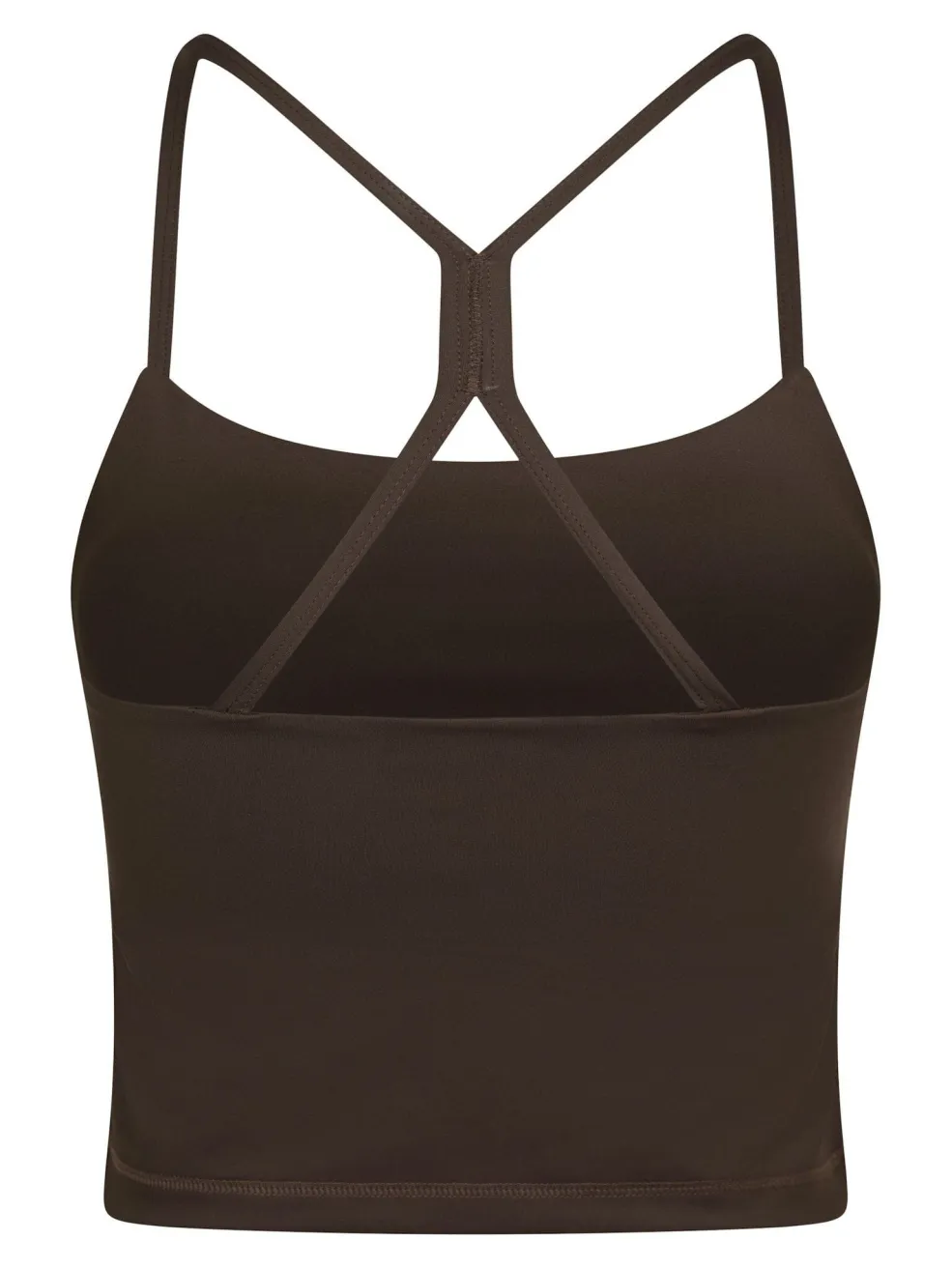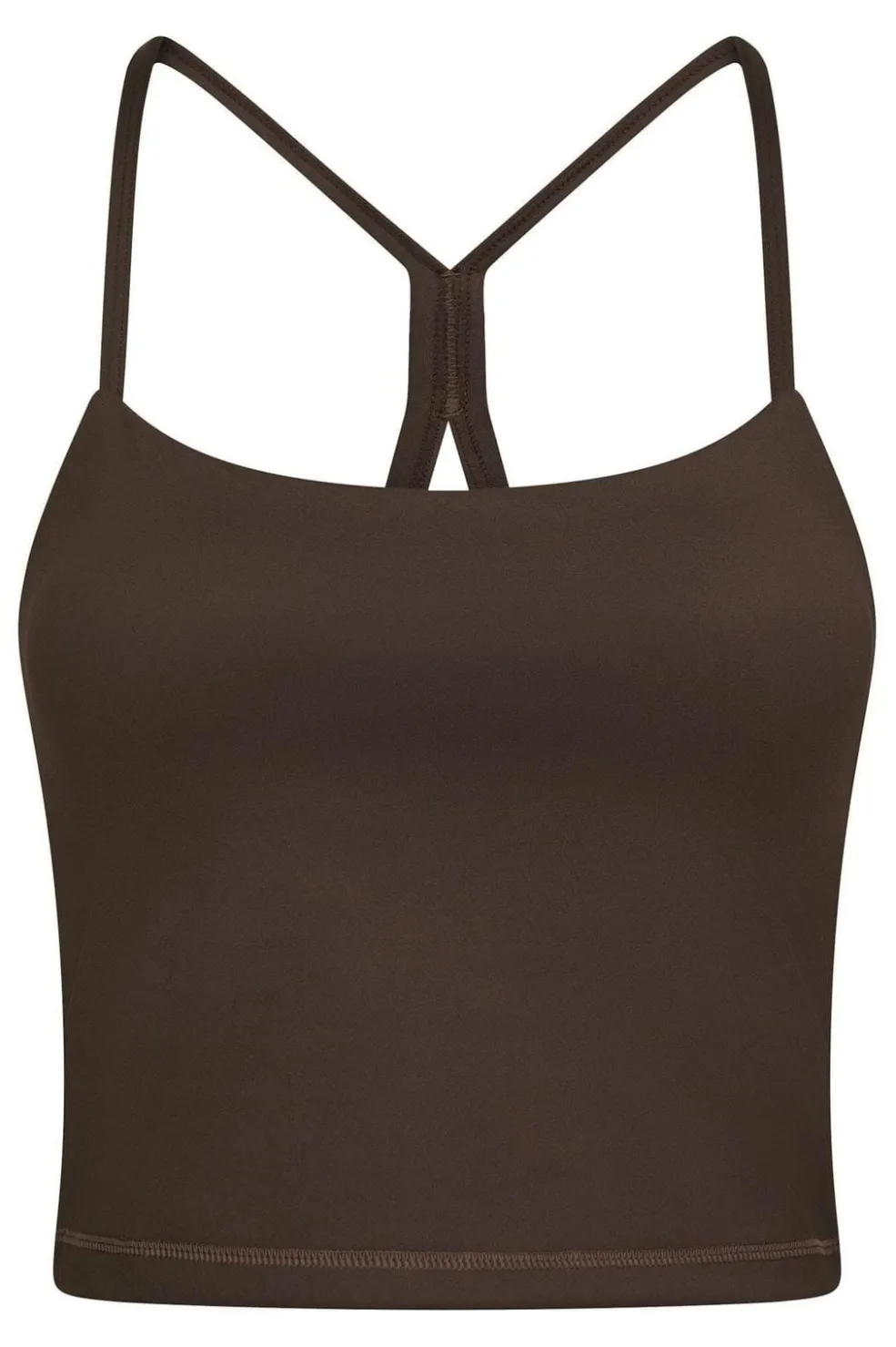 Brun top fra Neo Noir i en chokoladebrun nuance. Toppen har tynde spaghettistropper og et krydsdesign på ryggen.