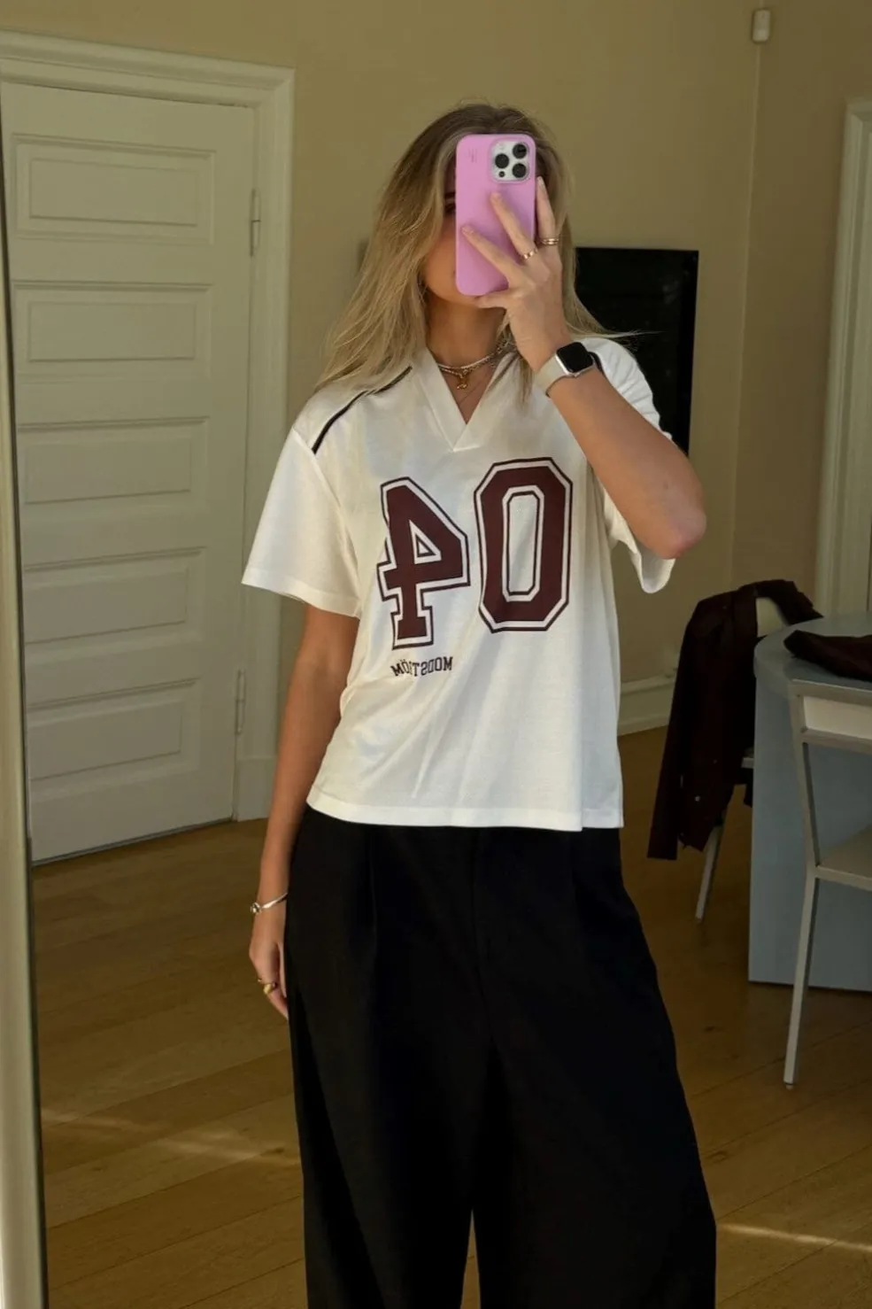 Cremehvid t-shirt fra Modström med sporty design. T-shirten har et stort 04-print på forsiden og bordeauxfarvede pipingdetaljer ved skuldrene og ryggen.