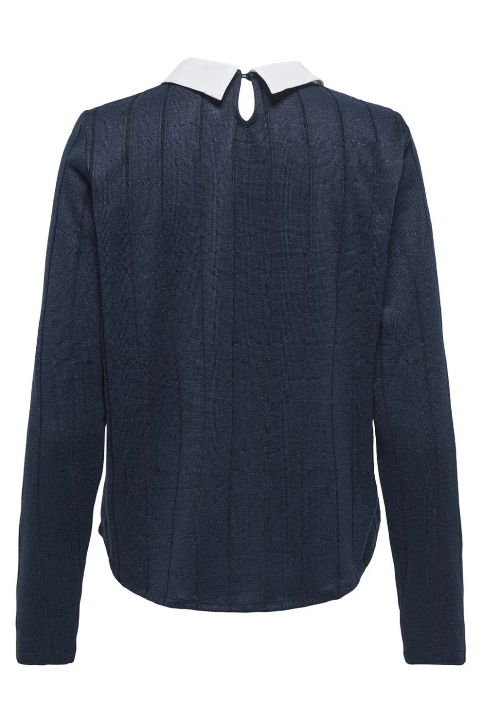 Mørkeblå langærmet top fra JDY med hvid Peter Pan-krave. Toppen har et lagdelt design med en hvid underdel og nøglehulsåbning i nakken med knaplukning.