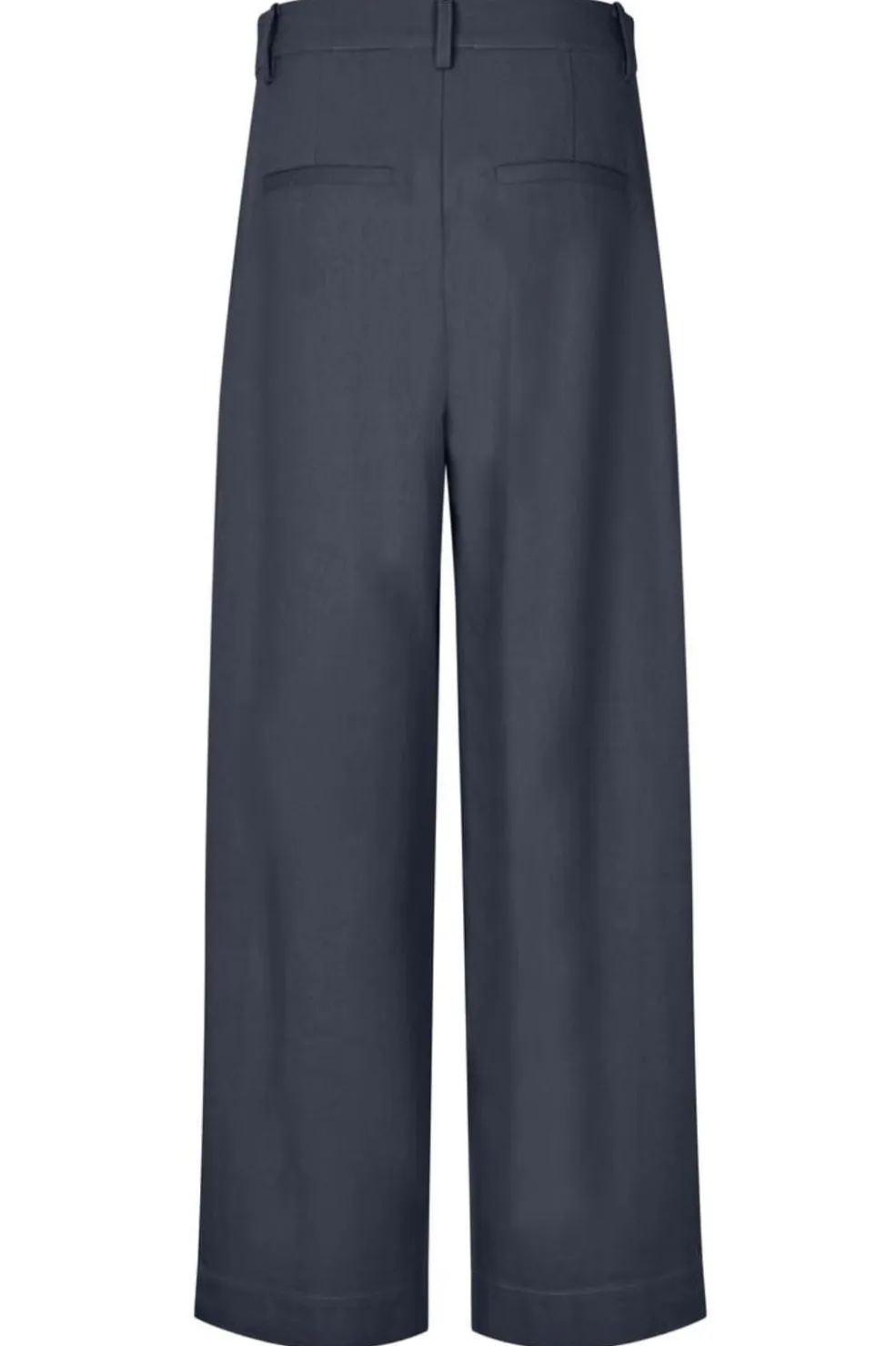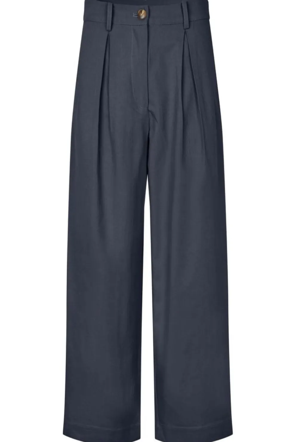 Habitbukser fra Modström i mørkeblå twill. Bukserne har vide ben med læg foran og en mellemhøj talje med synlig knap og lynlås.