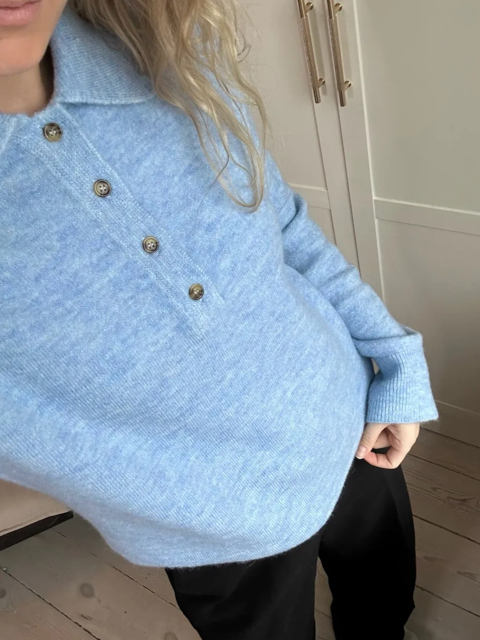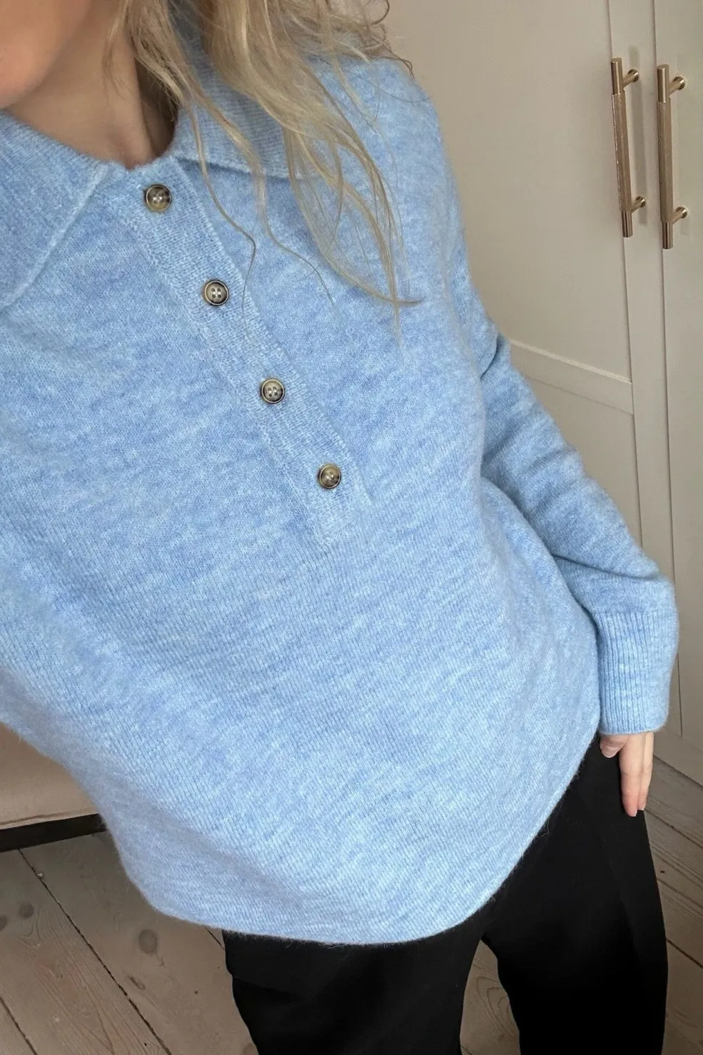 Strikket polo fra Modström i lyseblå. Den har en løs pasform med lange, brede ærmer og en klassisk polokrave med fire knapper foran.