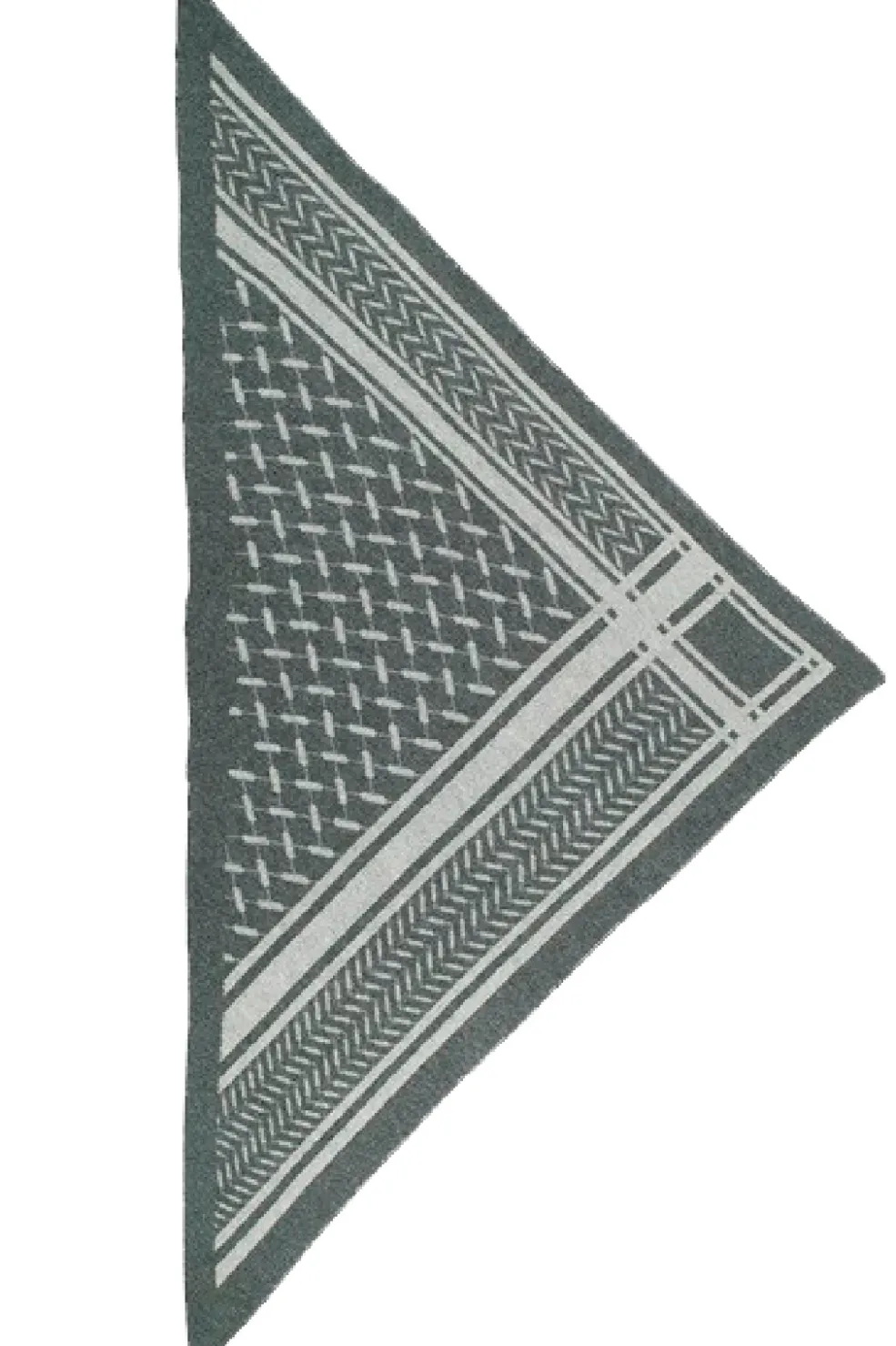 Trekantet tørklæde fra Lala Berlin i grå nuancer med geometrisk mønster. Det bløde cashmere-materiale kradser ikke på huden og giver god varme til halsen.