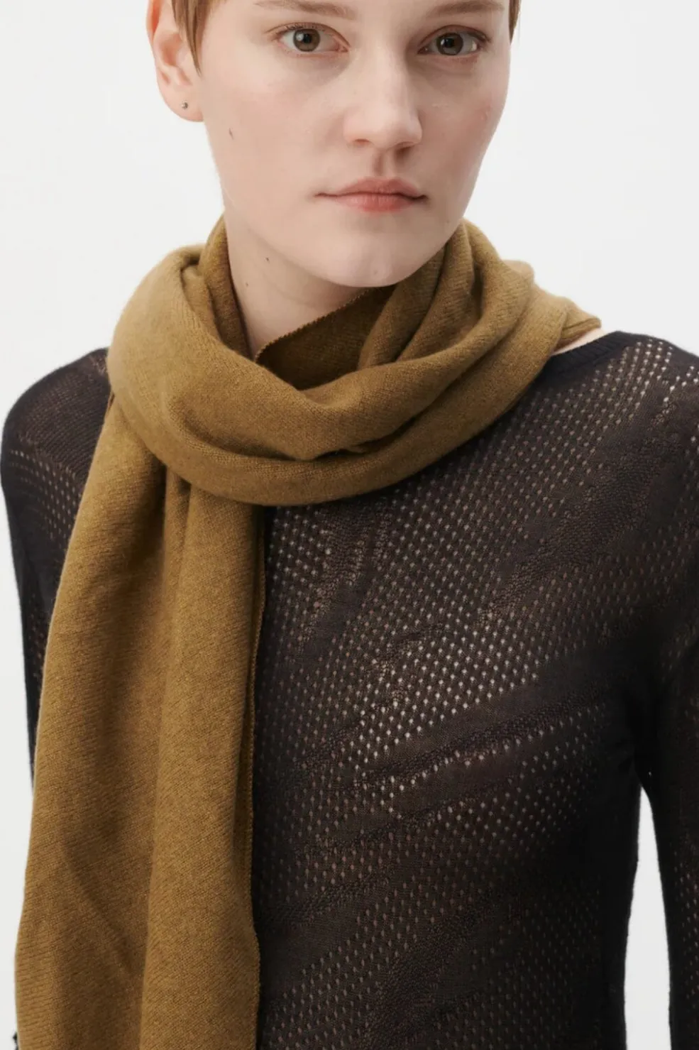 Trekantet tørklæde fra Lala Berlin i en brun mocca-farve. Det ensfarvede design har en blød overflade med det karakteristiske Lala Berlin-logo.