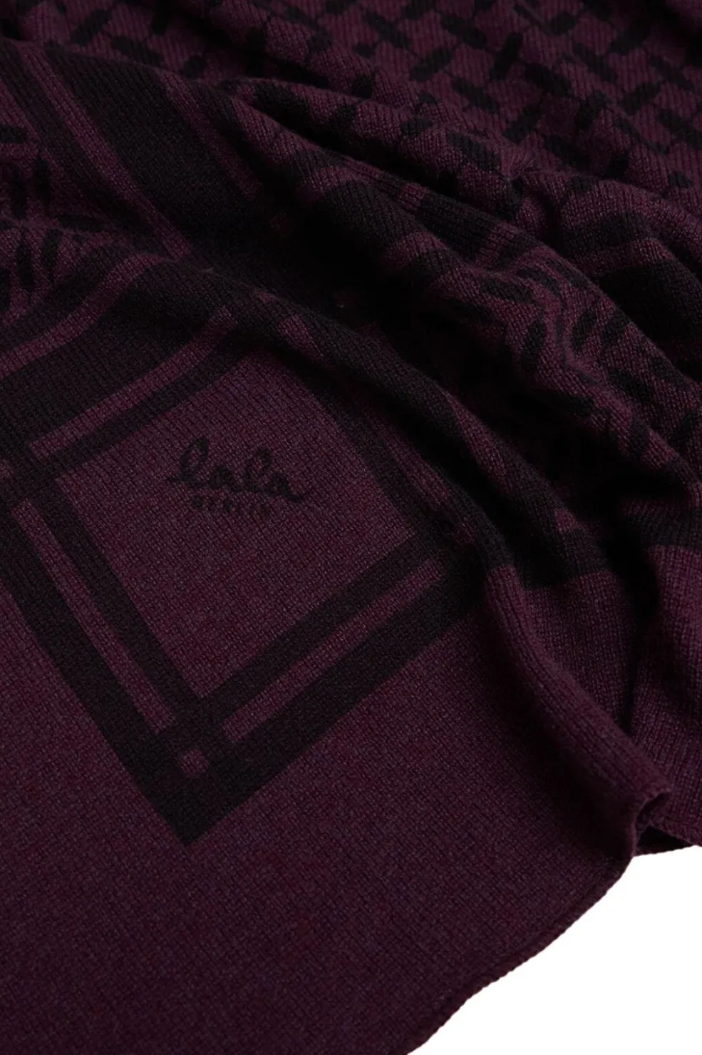 Trekantet tørklæde fra Lala Berlin i cashmere med sildebensmønster og print. Den dybe bordeauxfarve med sorte detaljer skaber et markant design med grafiske mønstre.