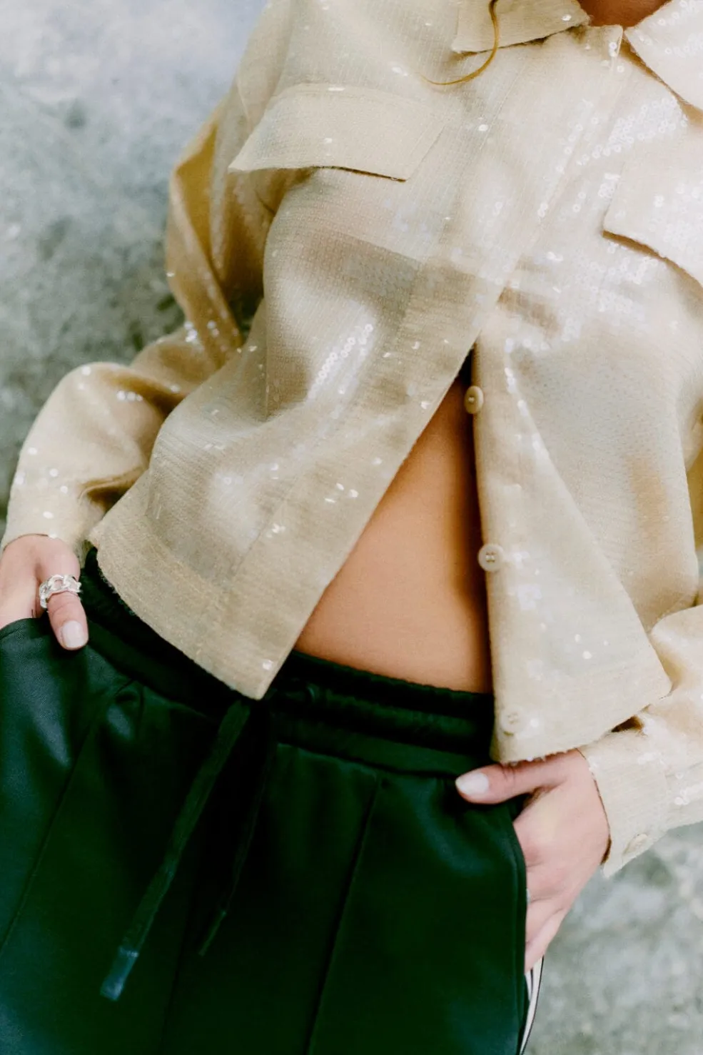Truckerjakke fra Copenhagen Muse i varm sandfarve med pailletter. Jakken har skjortekrave, knaplukninger og to frontlommer.
