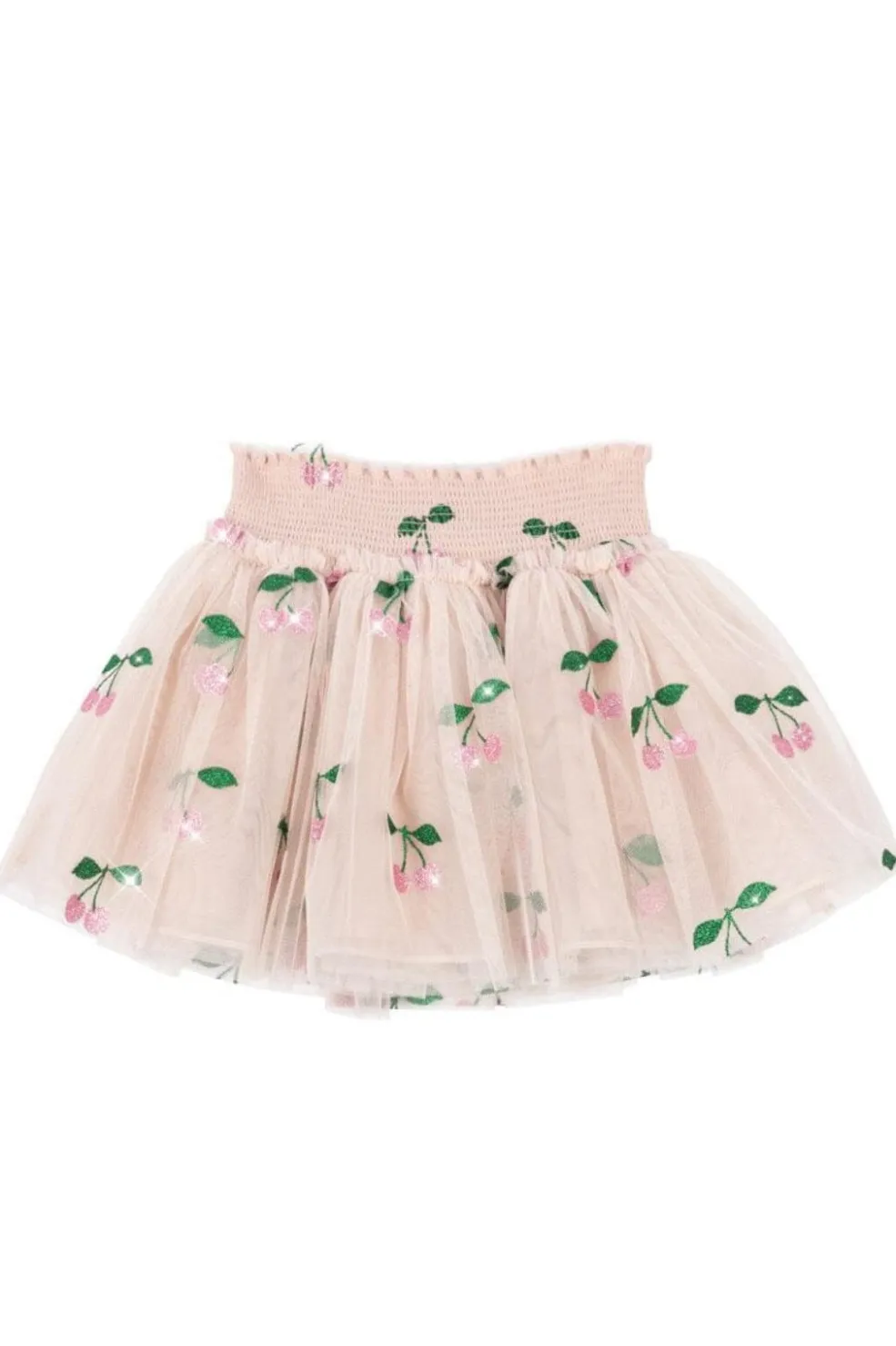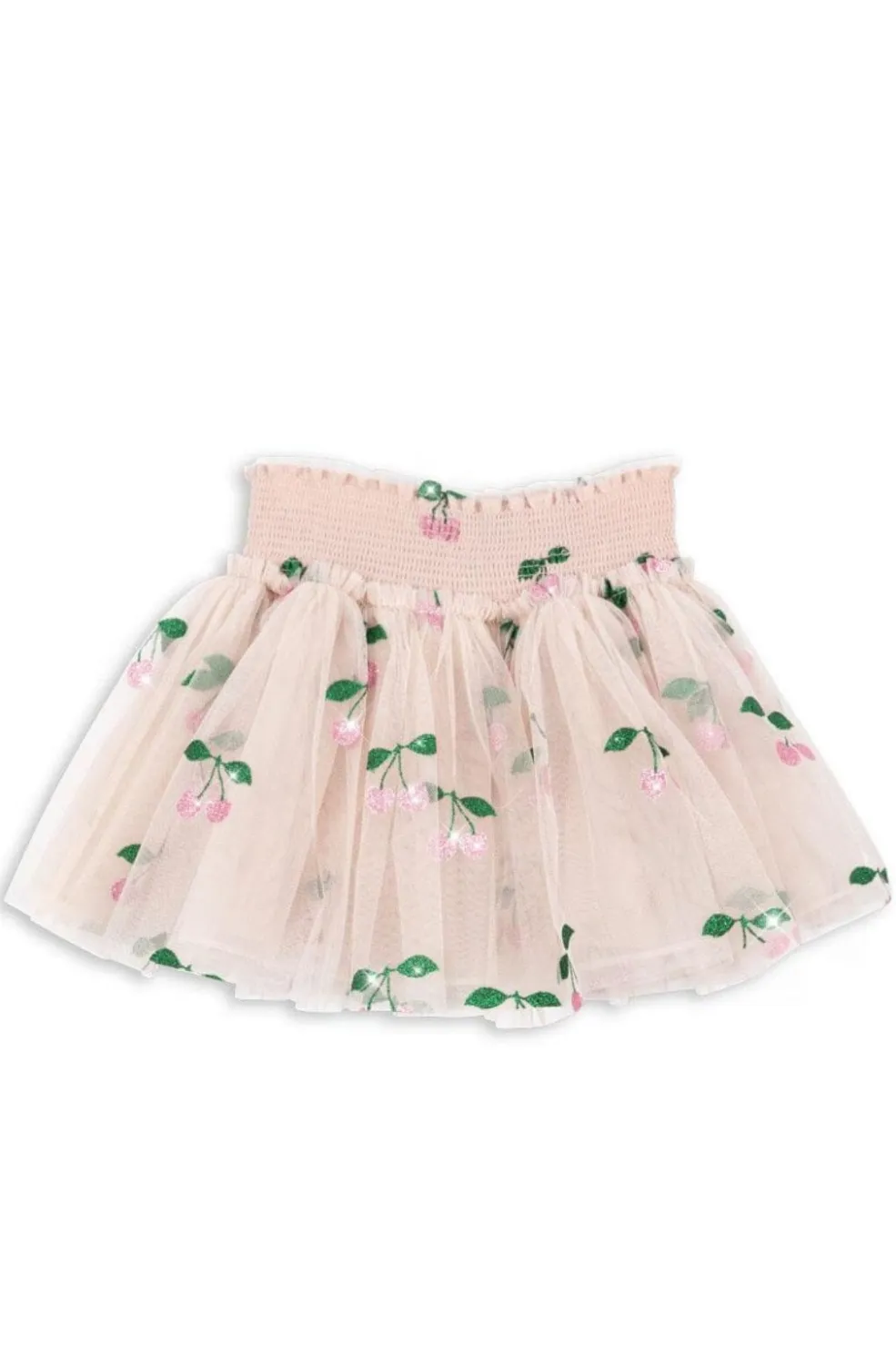 Nederdel fra Konges Sløjd i lyserød tyl med glitter. Dekoreret med broderede kirsebær i pink glitter og grønne blade.