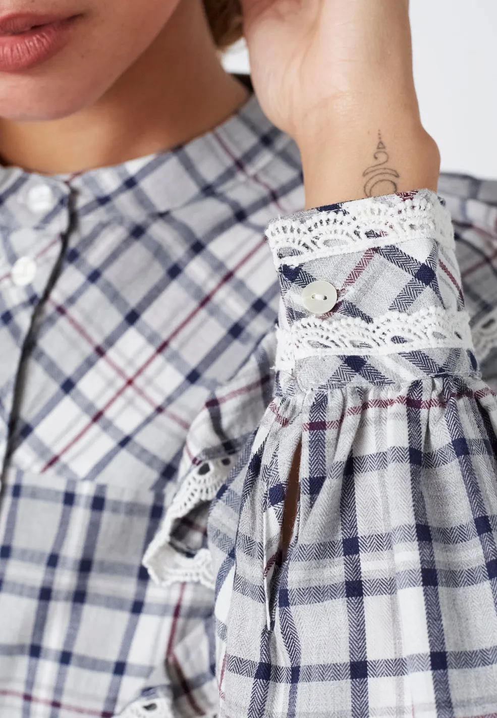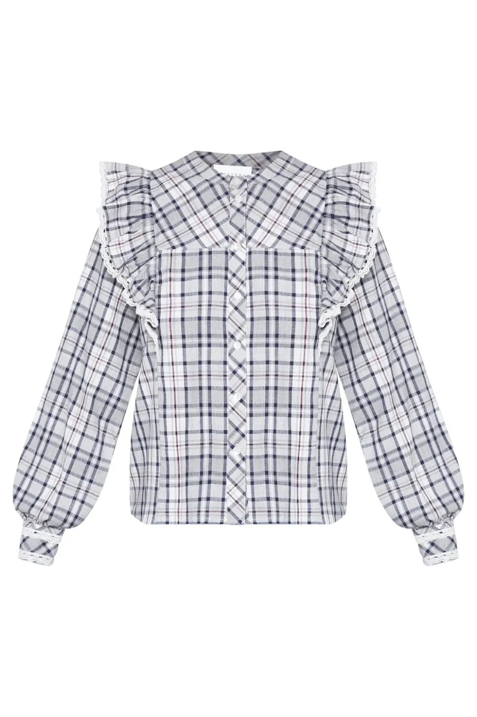 Ternet skjorte fra Sisters Point i grå nuancer med blå og hvide tern. Skjorten har en Peter Pan-krave og lange ærmer.