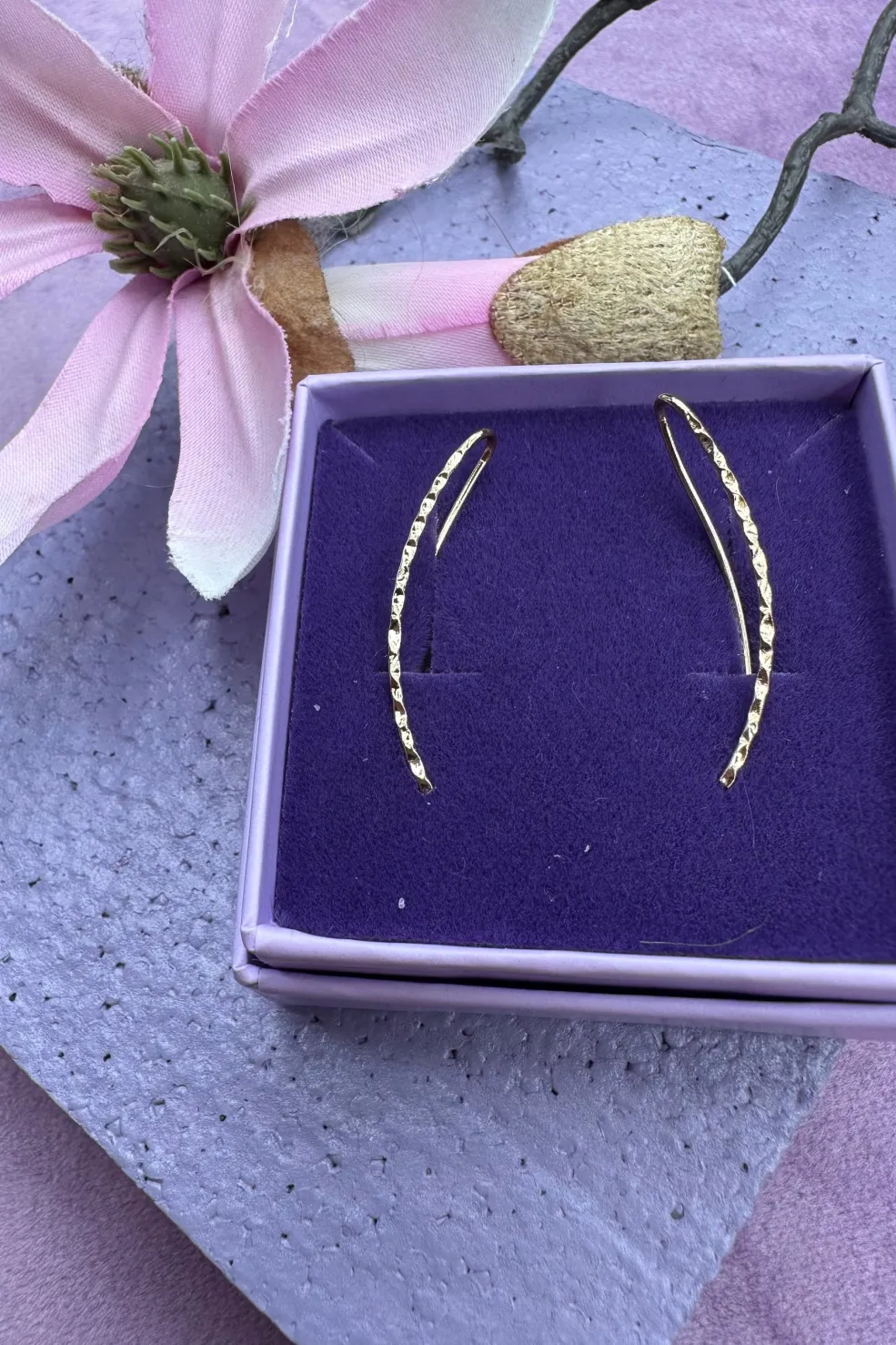 Forgyldte øreringe fra Mellow Moon med snoet tekstur. Øreringene følger ørets naturlige form og har et karakteristisk design med struktureret overflade.