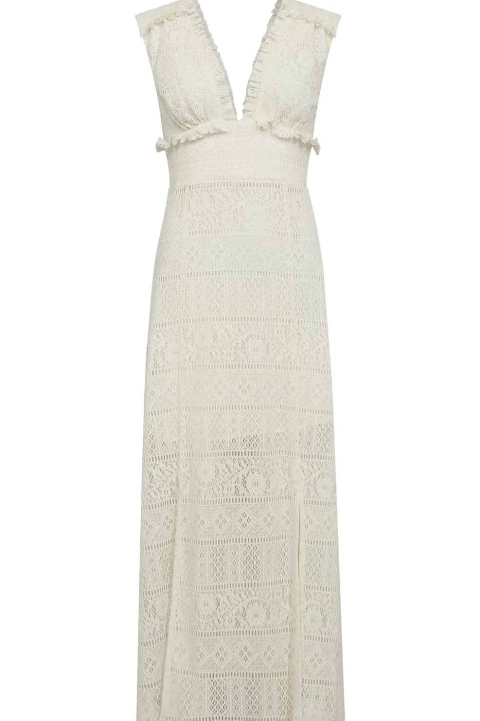 Blondekjole fra Haute L’Amitié i off-white. Kjolen har et detaljeret blondemønster og flæser ved skuldrene. Den er ærmeløs og har en dyb V-udskæring.