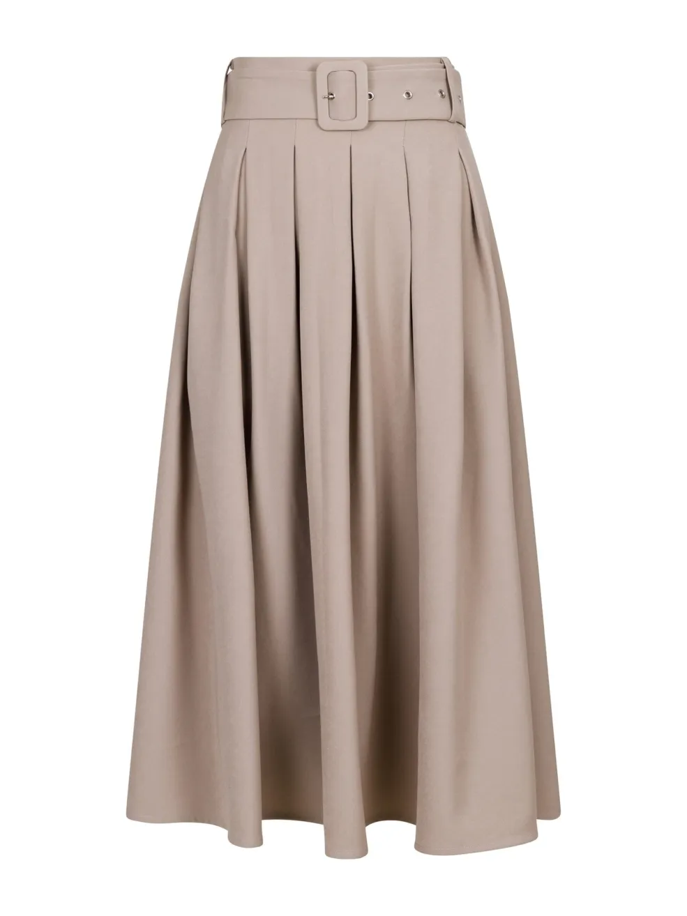 Sandfarvet plisseret nederdel fra Valentin Studio med høj talje. Nederdelen har bløde folder, bælte og elastik bagtil samt lommer foran.
