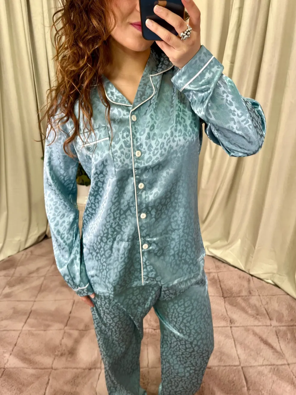 Lyseblå pyjamas fra A-bee med leopardmønster. Sættet har en slim fit-pasform og går til midt på læggen. Skjortekraven og knapperne giver et klassisk udtryk.