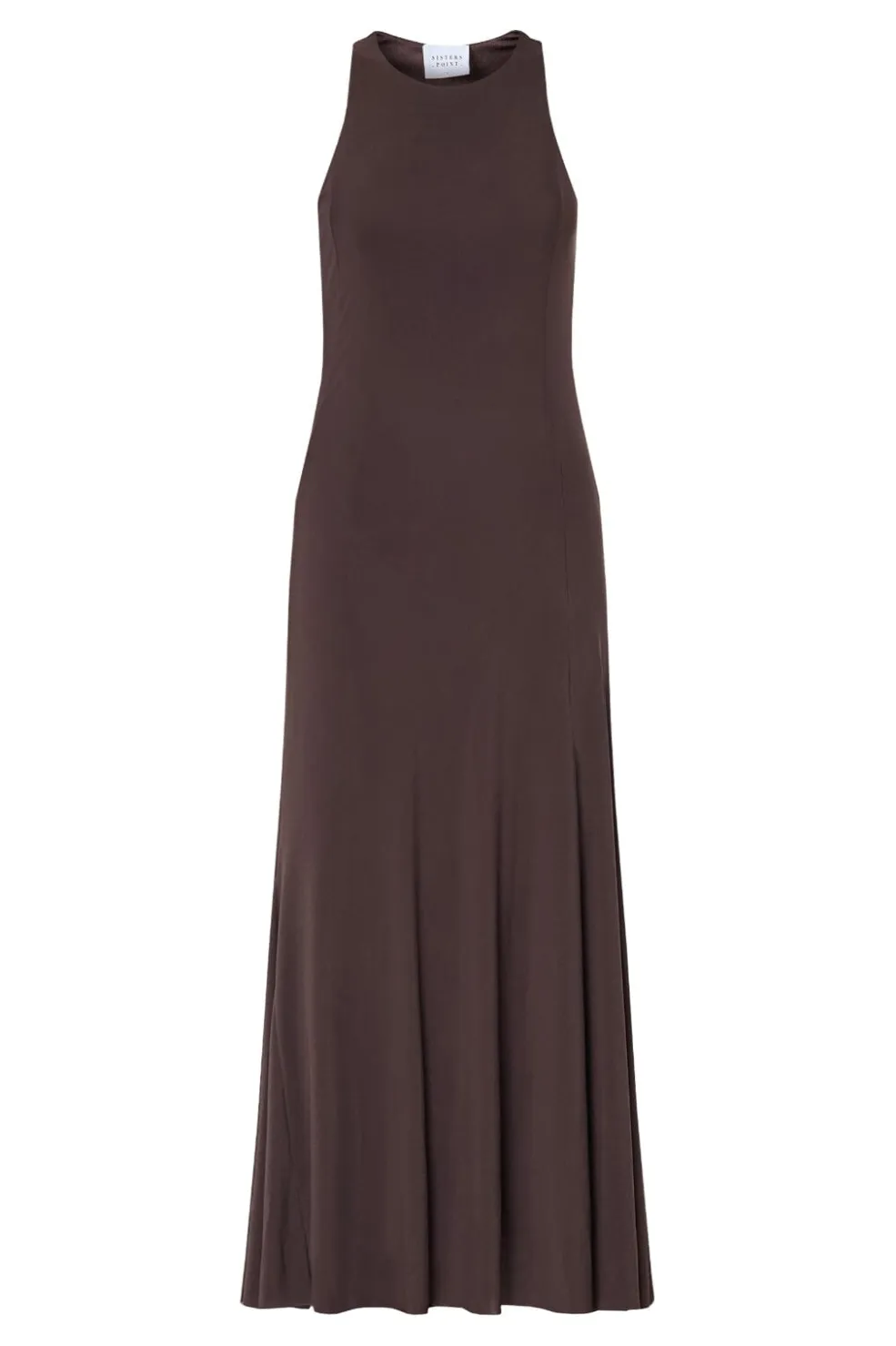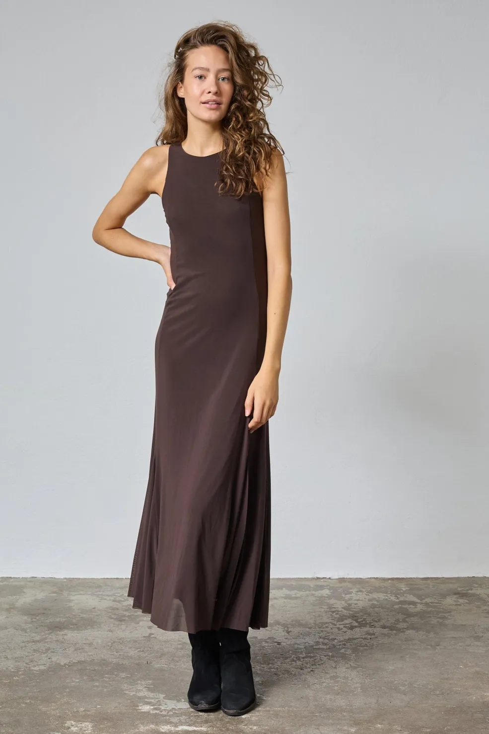 Lang brun kjole fra Sisters Point uden ærmer. Kjolen har en høj halsudskæring og en løs pasform forneden med slids i siden.