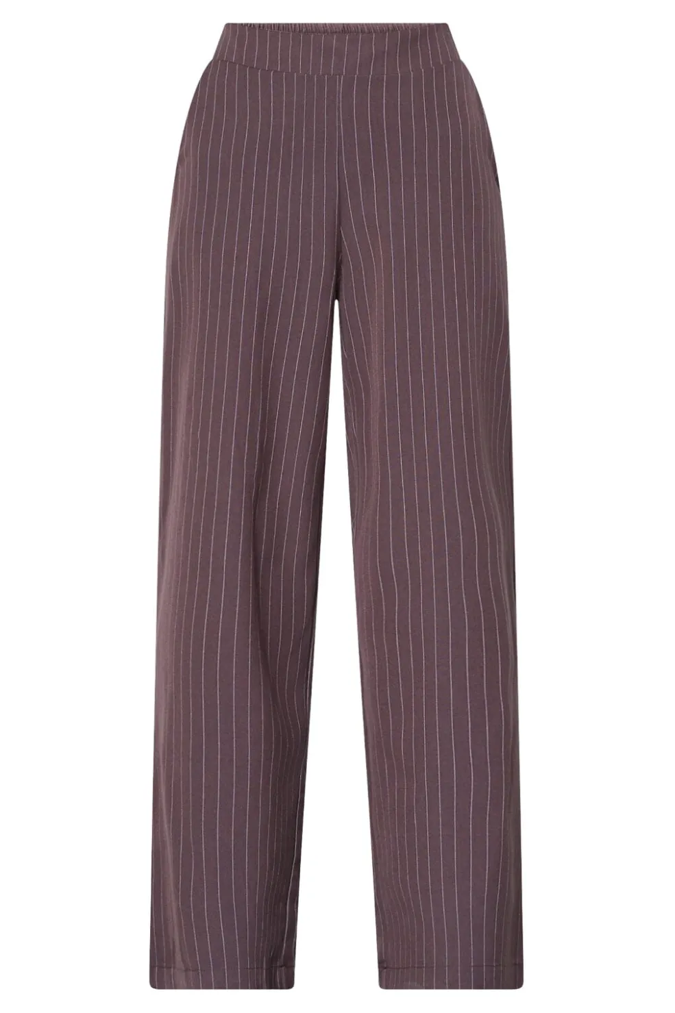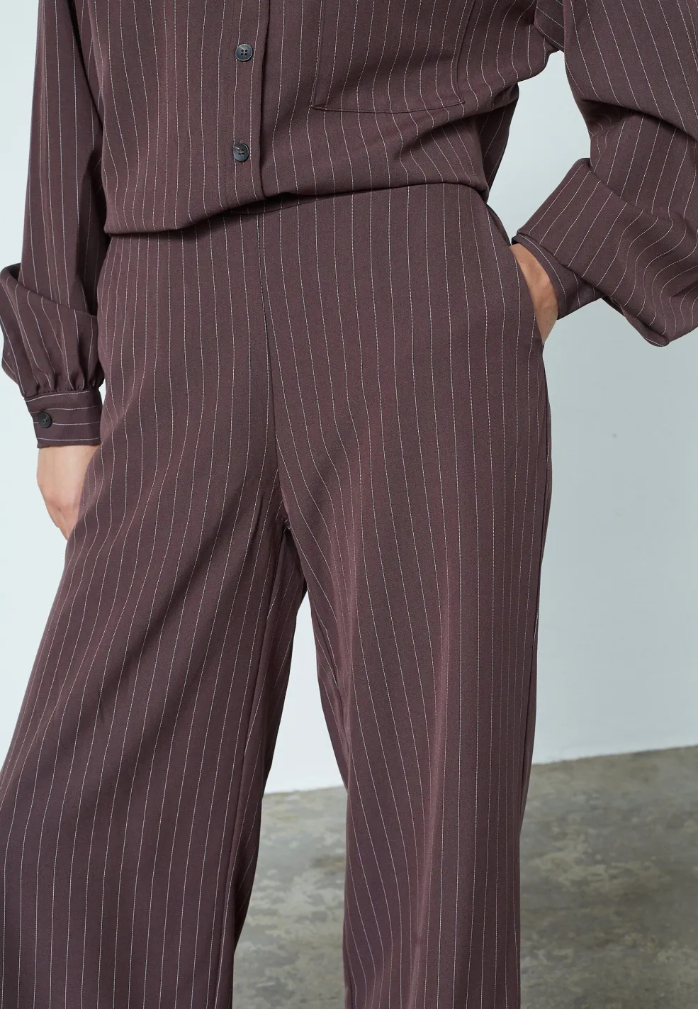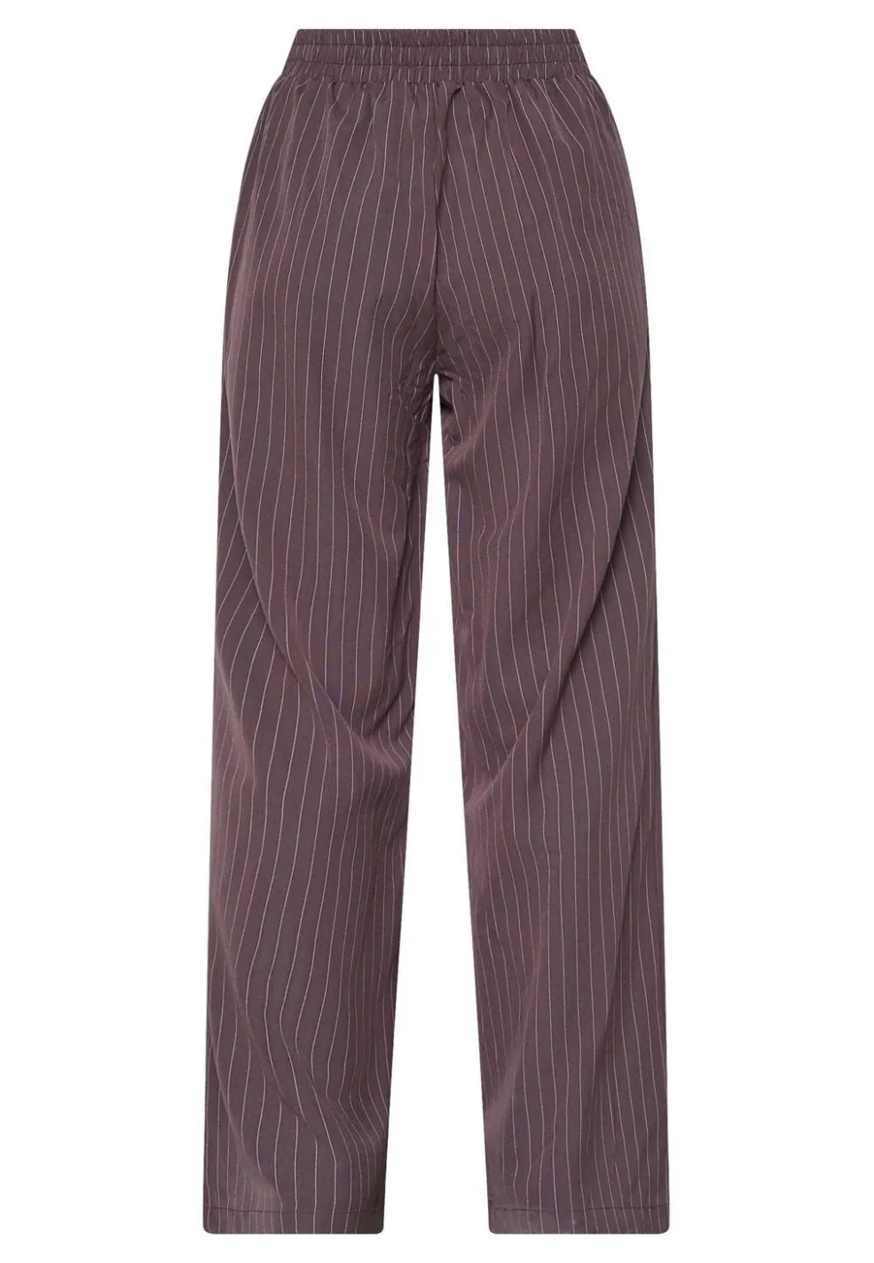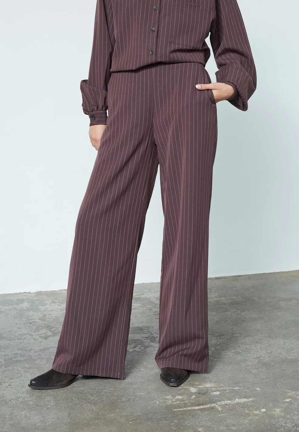 Gulvlange bukser fra Sisters Point med lodret stribemønster i brun og creme. Bukserne har en løs pasform og høj talje.