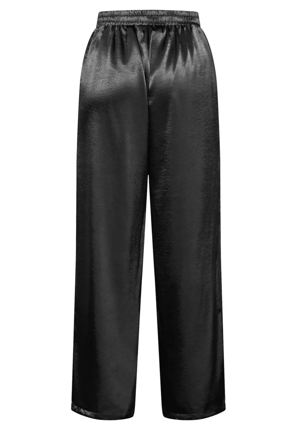 Sorte bukser fra Sisters Point i satinlignende stof. Bukserne har en gulvlang længde og er velegnede til både festlige og formelle lejligheder.