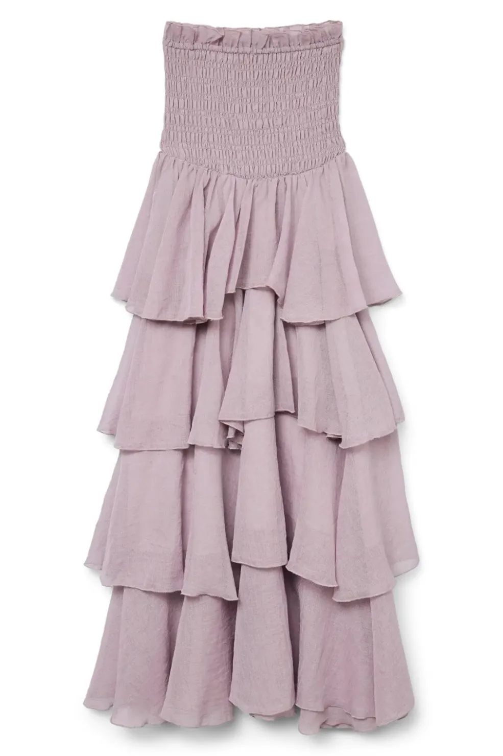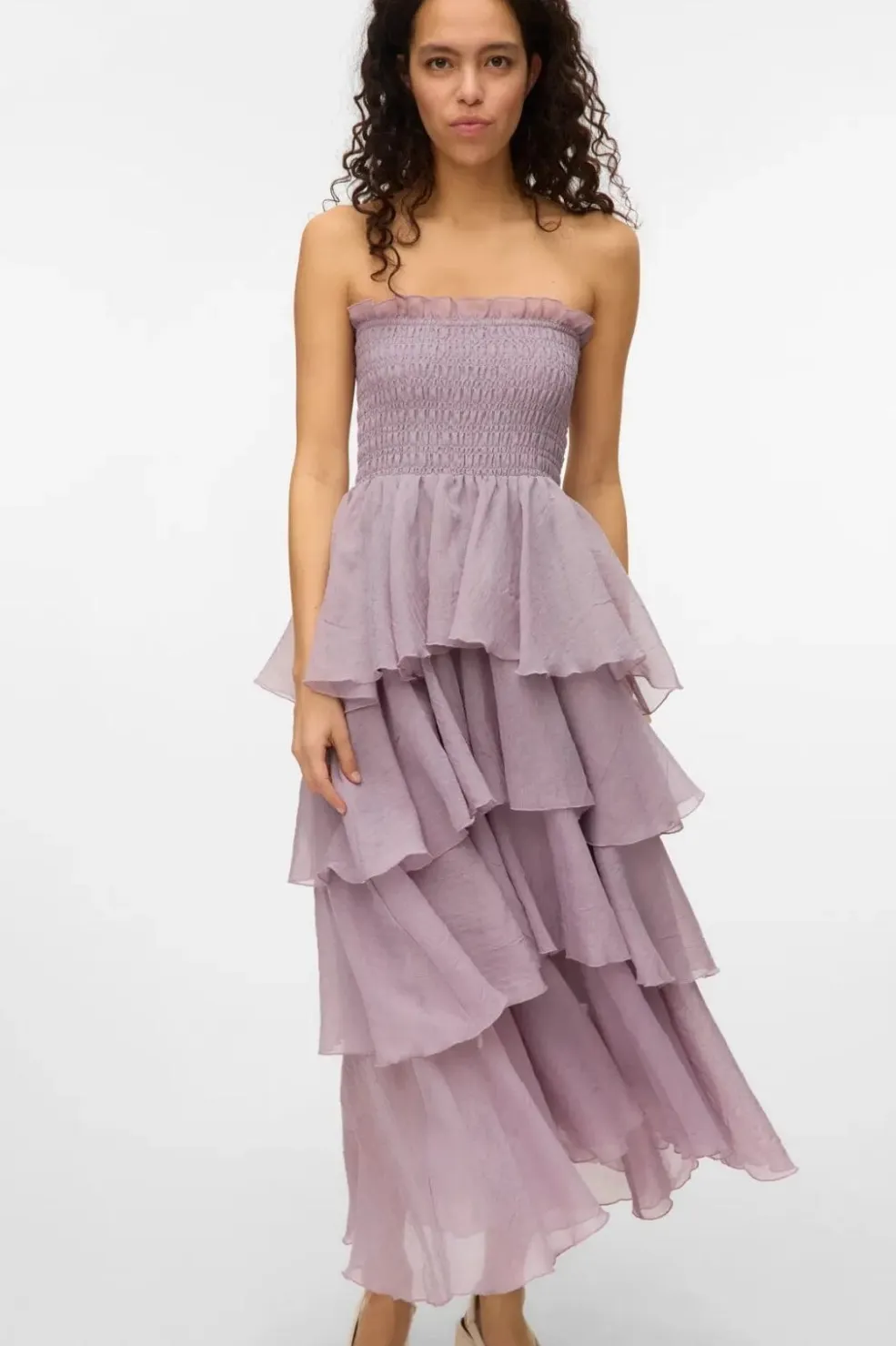 Lang kjole fra Vero Moda i lilla med smock-detaljer. Den har en stropløs off-shoulder-halsudskæring og flere lag af flæser fra top til bund.