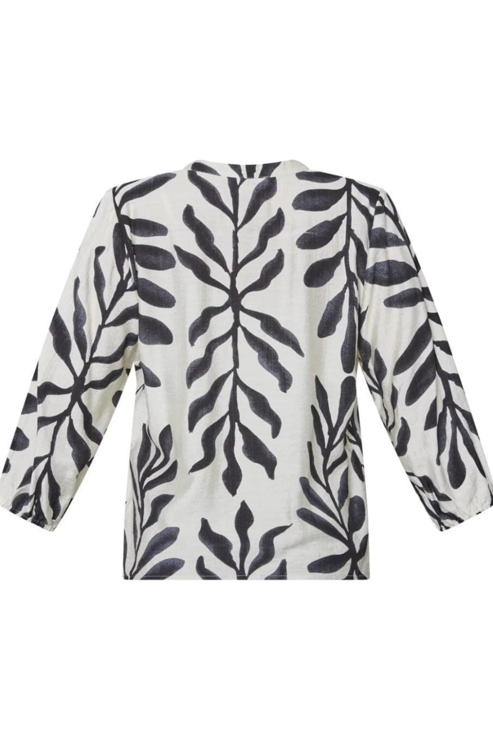 Skjorte fra Sisters Point med sort bladmønster på cremefarvet baggrund. Skjorten har v-hals, trekvartlange ærmer og knaplukning foran. Den løse pasform giver god bevægelsesfrihed.