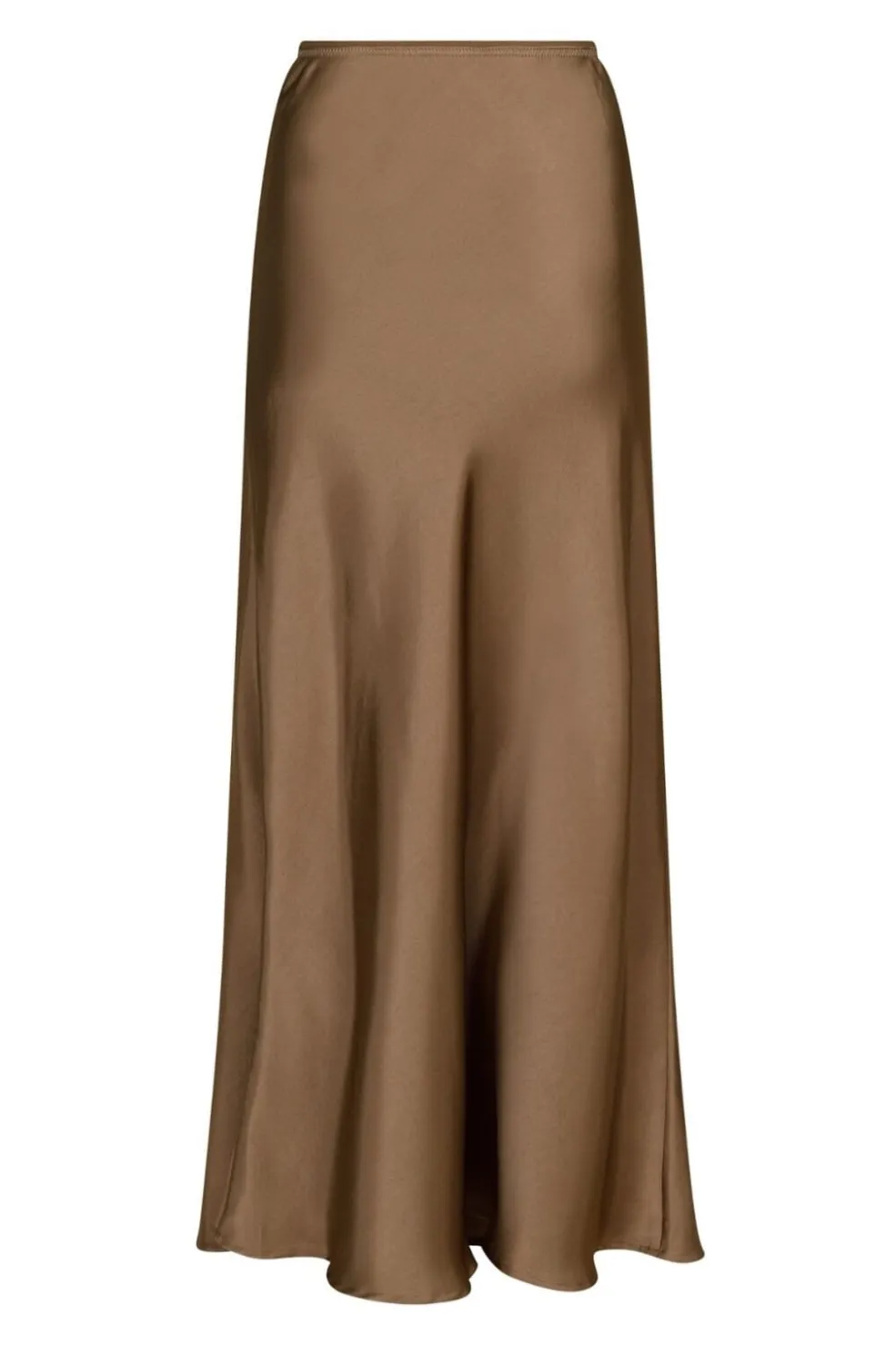 Lang nederdel fra Neo Noir i mørk taupe. Nederdelen er skåret på skrå og har en blød satinoverflade med elastik i taljen.