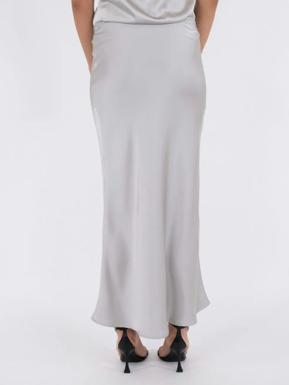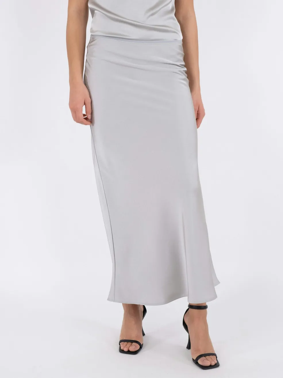 Lang sølvfarvet nederdel fra Neo Noir i blødt satin. Nederdelen har skrå snit og flæser, der giver bevægelse til designet. Den indvendige elastik i taljen sikrer en behagelig pasform.