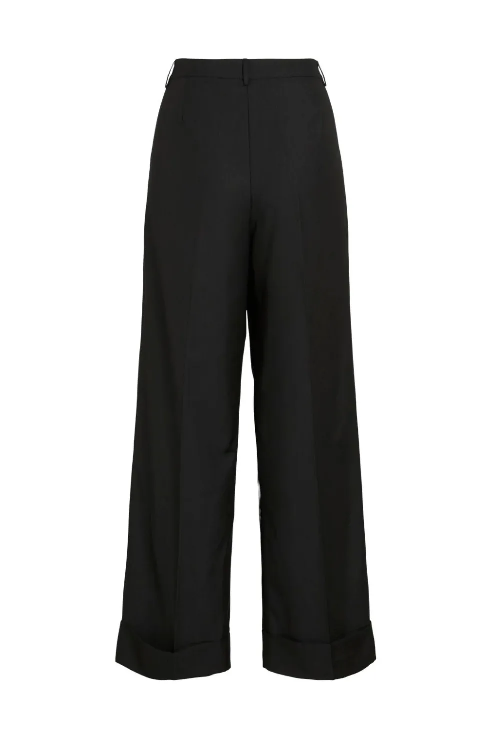 Sorte bukser fra Vila med høj talje og løs pasform. Bukserne har brede ben med oprullede manchetter og bæltestropper i taljen. De er udstyret med sidelommer samt praktisk lynlås- og knaplukning.